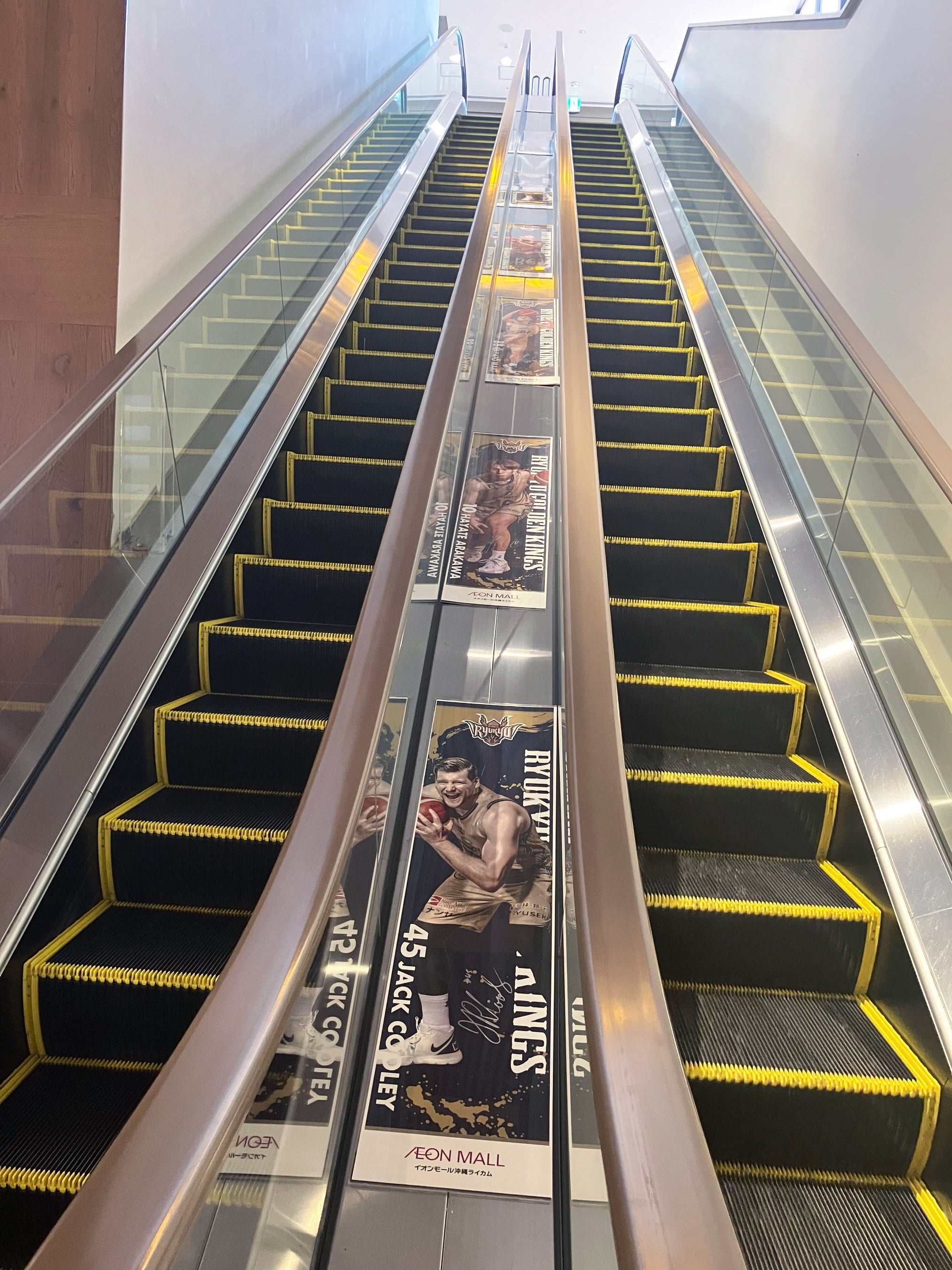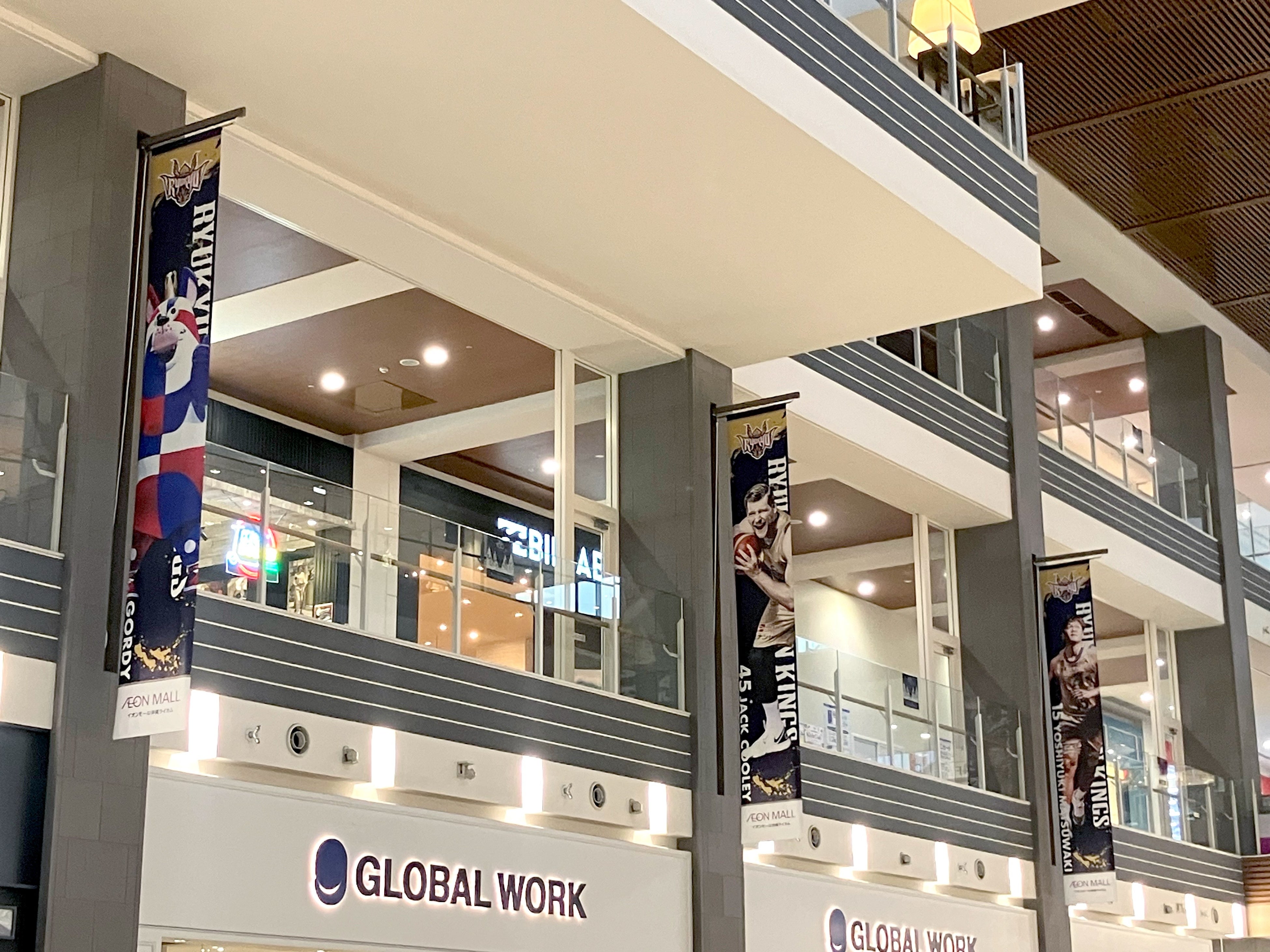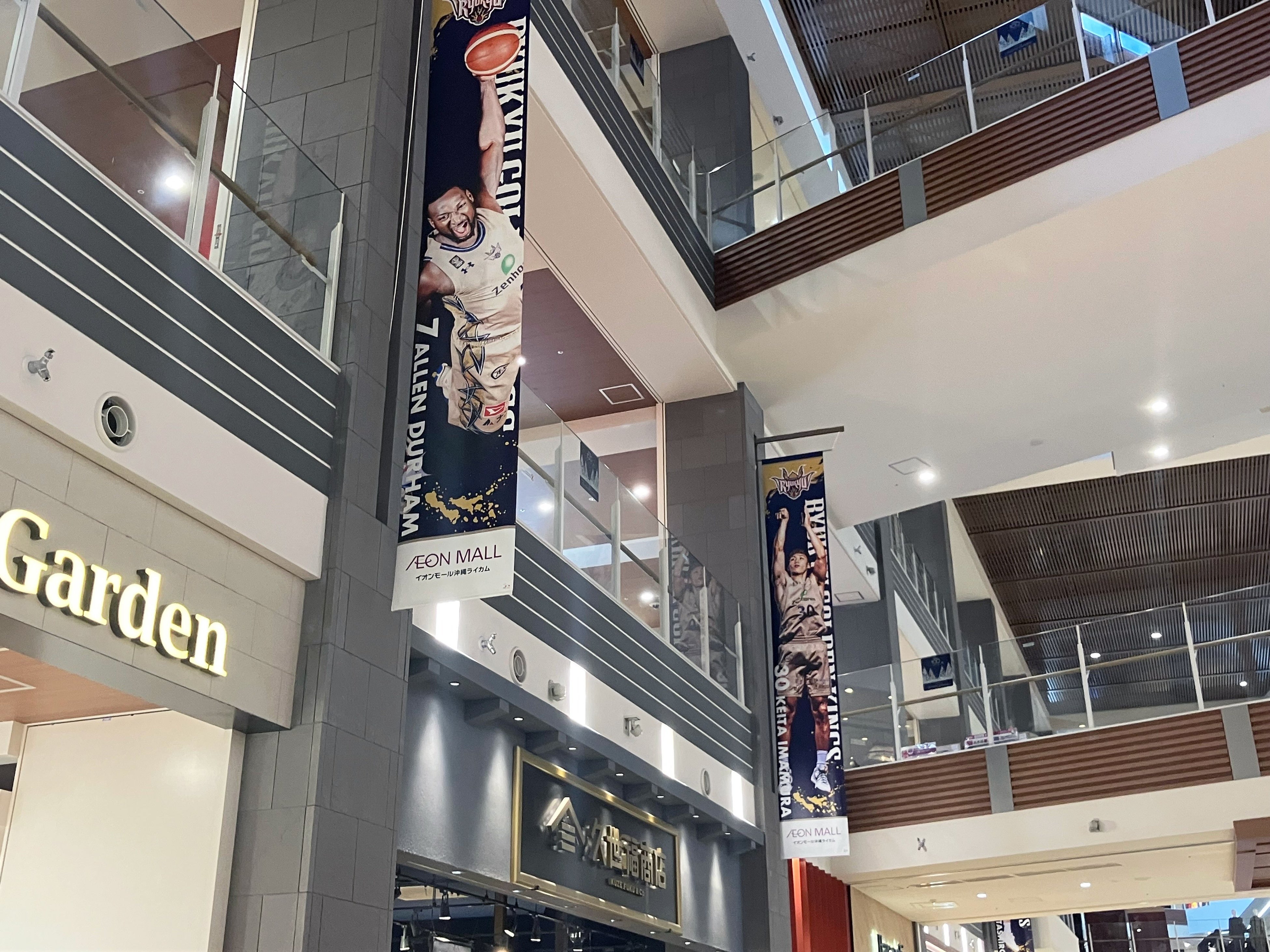 イオンモール沖縄ライカムの吹き抜けコンコースには躍動感のある選手や、かわいらしいゴーディーの特大吊り旗、エレベーター横には選手サイン入りバナー装飾が展示されています。