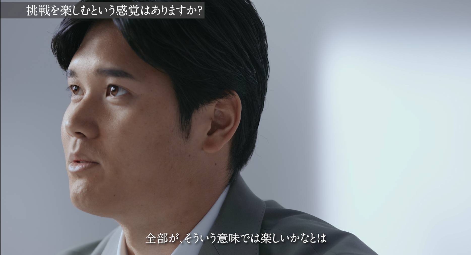 本WEB動画は、大谷選手が試合に臨むにあたり、プレッシャーのかかる場面で結果を残すことへの面白さについて語っています。なかなか成果が出ないときや根気が必要なときに、挑戦を続けることを諦める人が多い中、それでも頑張りたいと思える「何か」を見つけることが重要であると説きます。大谷選手は、何かに挑戦している人へ向けて、自分がそうしているように、目標達成に向けて可能な限り時間を割いて頑張ってほしいとエールを送ります。