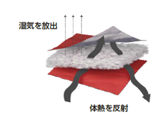 体の熱を反射して、衣服内で暖まった空気を逃さない特許取得の断 熱テクノロジー。より少ないインサレーションでより高い保温性を 発揮する。