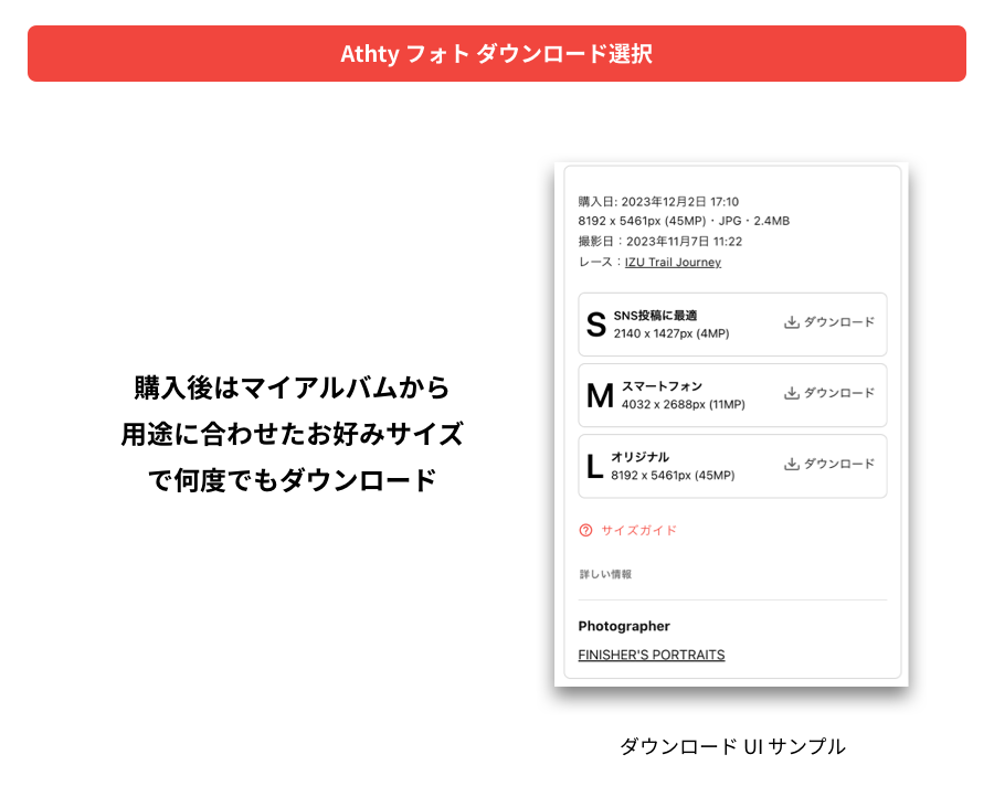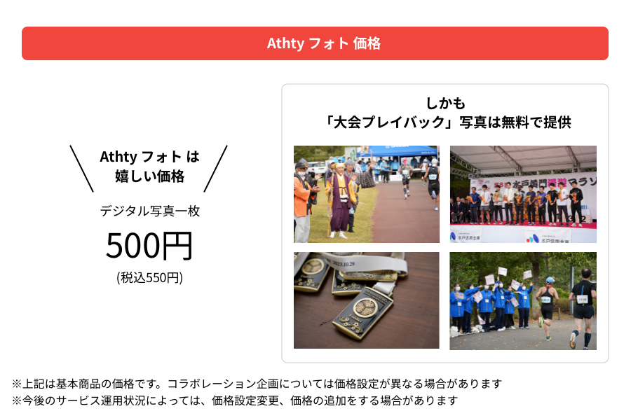 また、大会の様子や多数のランナーを収めた、個人にフォーカスしていない「大会プレイバック」写真については、Athty フォトグラファー協力のもと無料で提供します。