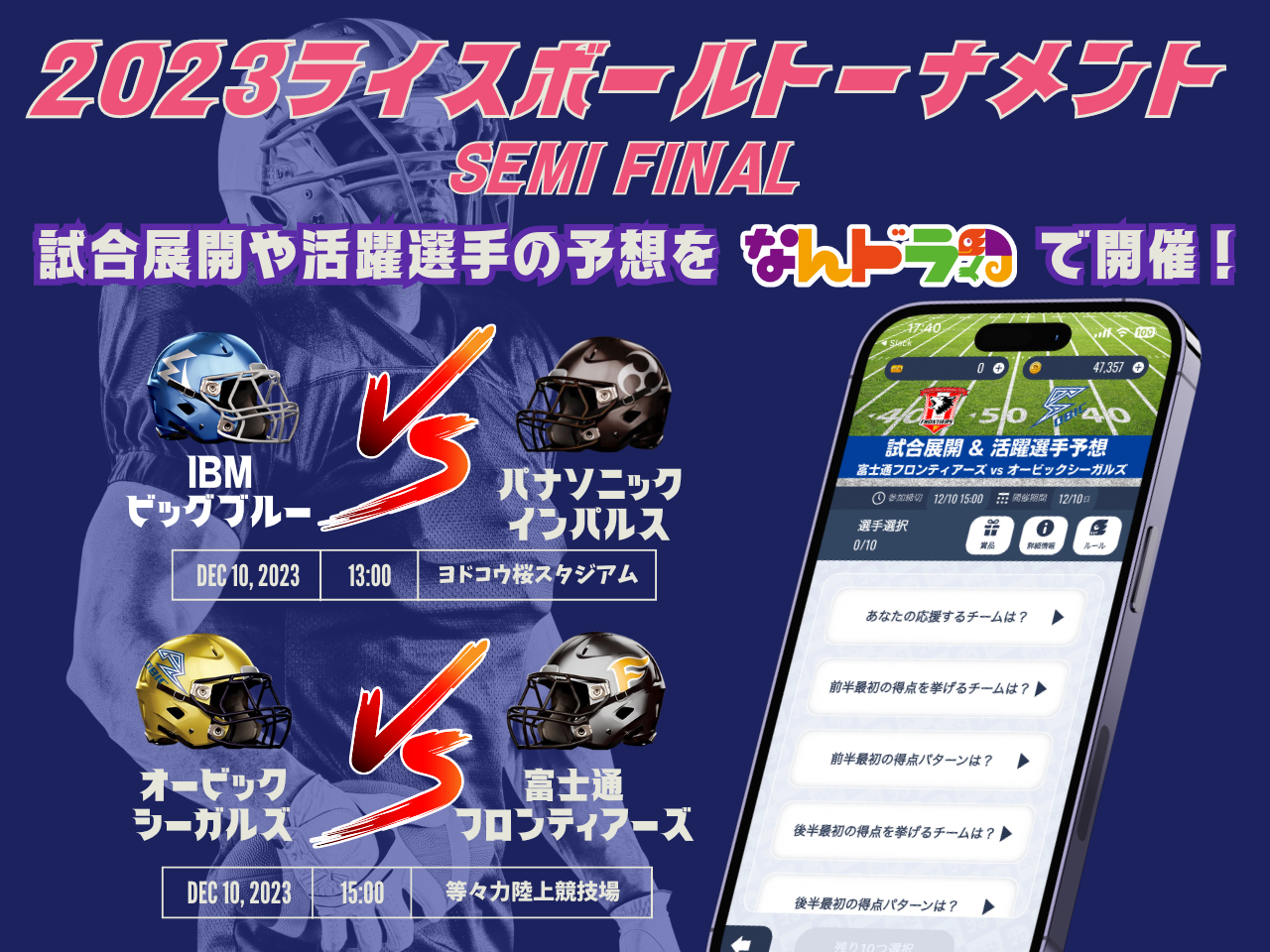ヨドコウ桜スタジアムで行われるIBM BIG BLUE vs パナソニック インパルスと、等々力陸上競技場で行われるオービックシーガルズ vs 富士通フロンティアーズの試合展開や活躍選手を「なんドラ」で予想!