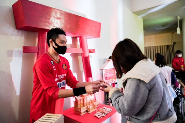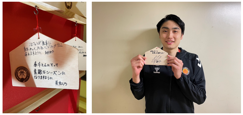「ドルフィンズ大社」は、中務選手のアイディアで、ドルファミの皆さまとの交流が減ってしまったコロナ渦に生まれた社。ドルフィンズレッドに染められた社や部品は、中務選手が廃材を使用し、自ら設計、造作、色塗り、イベント企画まで担当。昨年12月30日~1月29日のホームゲーム会場設置期間中には、延べ150人の方々が願いを込めた絵馬を掛けました。また、手術を控えたファンの願いを込めた絵馬を見つけた選手の発案で、サイン色紙やユニフォームなどをプレゼントし激励するなどの交流も生まれました。