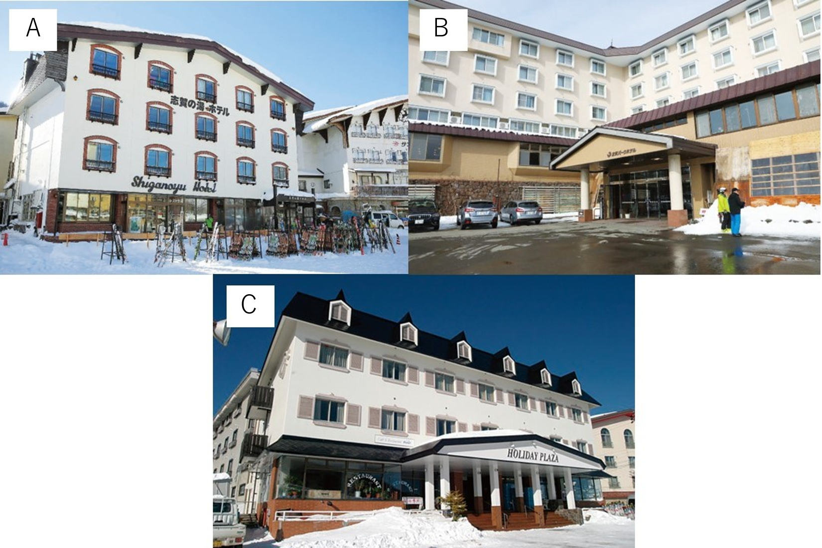 ■宿泊施設外観:A 志賀の湯ホテル B 志賀パークホテル C ホリデープラザ志賀高原