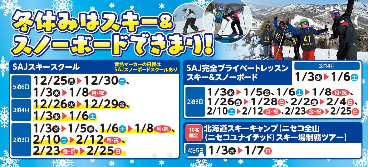 スキーレッスンの講師は全日程SAJ(全日本スキー連盟)公認のインストラクターです。未経験者から上級者まで、お子様一人ひとりのスキーレベルやクセなども見ながらしっかり指導します。その指導力で、初心者~上級者問わず数多くのSAJ検定の合格者を毎年輩出しています。