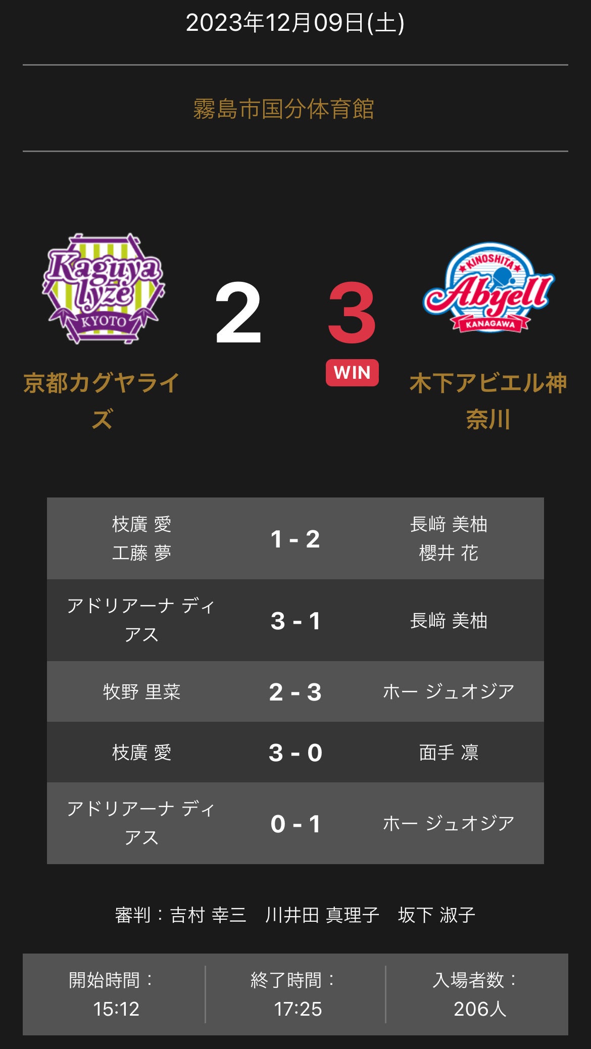ホームプレスリリース ノジマTリーグ 2023-2024シーズン 公式戦 12月9日開催 京都カグヤライズvs木下アビエル神奈川試合結果 2023年12月09日 18時40分 公開|スポーツマニア編集部プレスリリース 一般社団法人Tリーグのプレスリリース 京都カグヤライズと木下アビエル神奈川の試合は、3-2で木下アビエル神奈川が勝利しました。