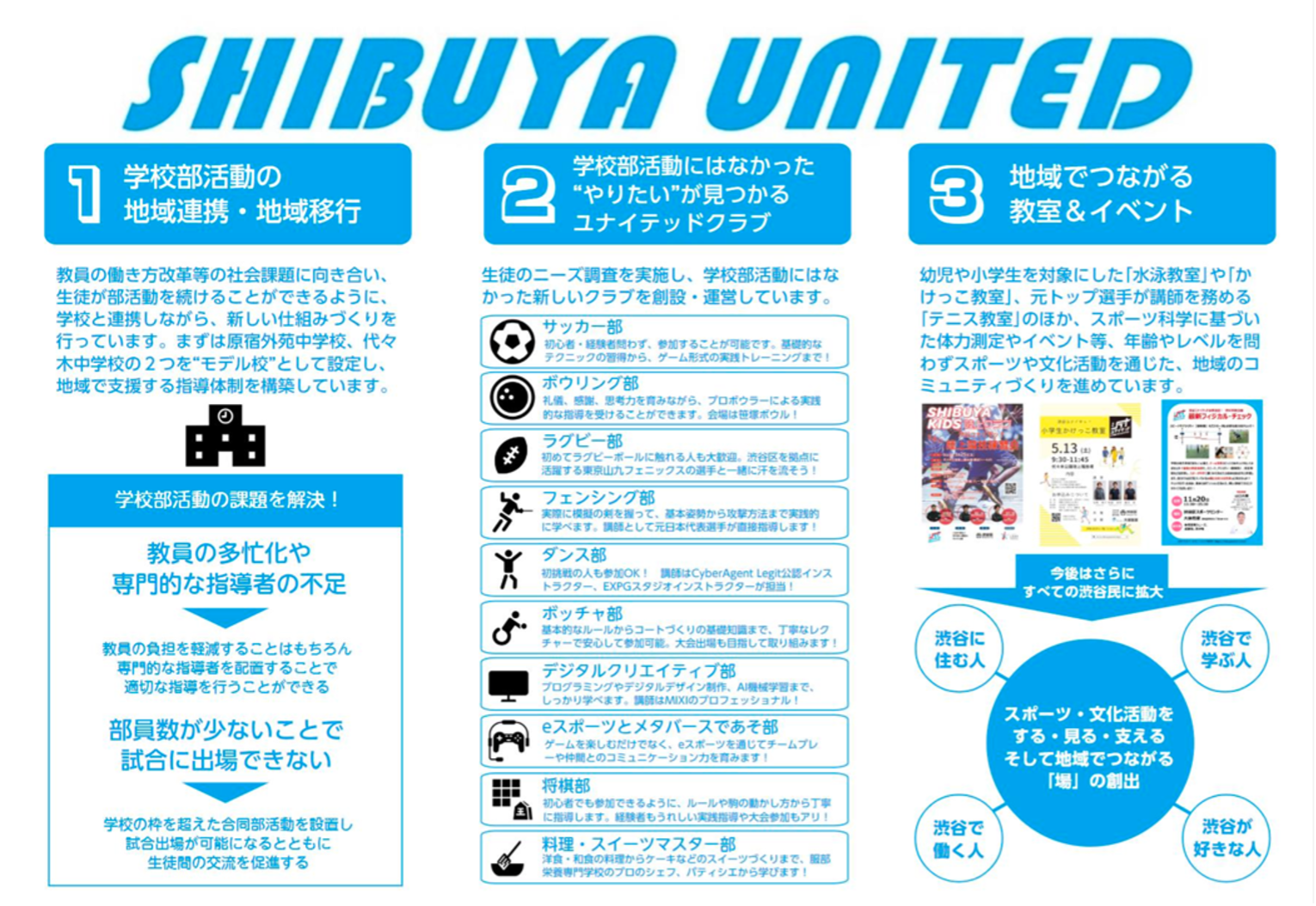 渋谷ユナイテッドは、渋谷区のスポーツや文化活動の振興・普及を担う組織として2021年に設立された渋谷区発の社団法人です。同法人の推進する、シブヤ「部活動改革」プロジェクトでは、既存の学校部活動の地域連携/地域移行に向けた仕組みづくりや、eスポーツやボウリング等の幅広い生徒ニーズを汲んだ独自クラブの運営、更には年齢やレベルを問わないスポーツ・文化活動を通じた地域コミュニティづくりなど、様々な事業を推進しております。