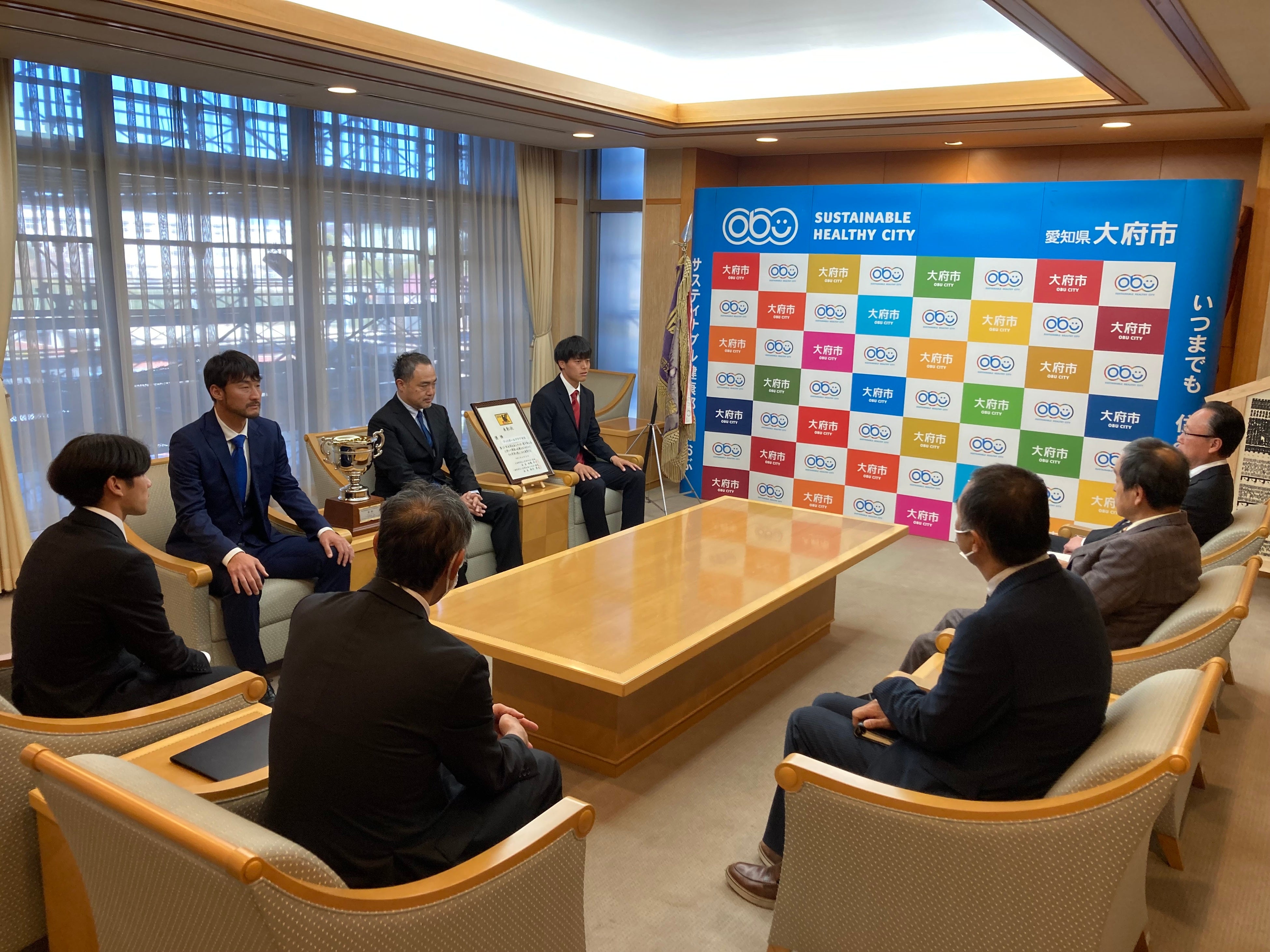佐々木賢二代表取締役社長と尾﨑僚選手と茂庭照幸選手と齋藤雅之選手が12月6日(水)大府市役所へ訪問し、第59回全国社会人サッカー選手権大会で優勝したことをホームタウンである大府市の岡村秀人市長に報告いたしました。