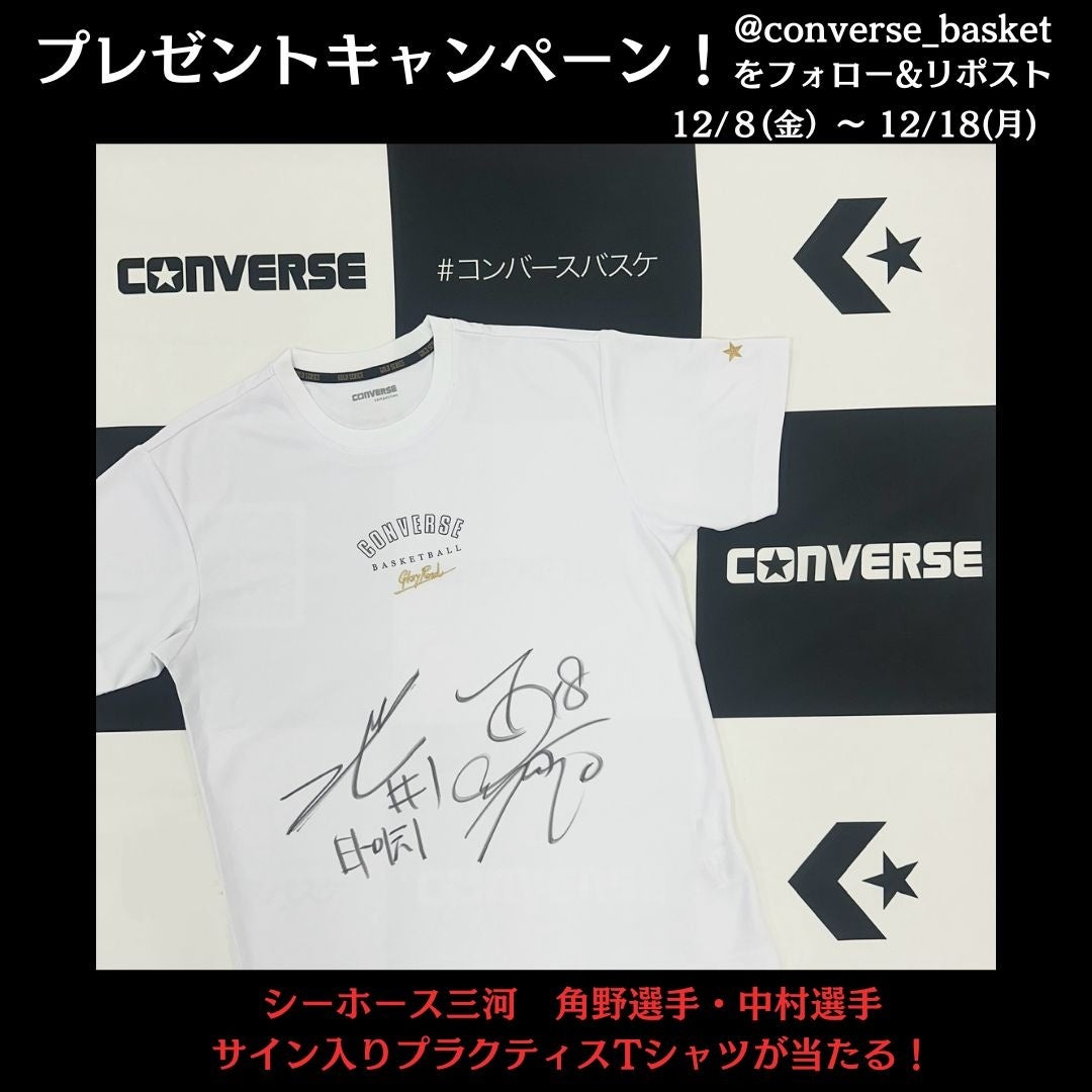 CONVERSE Basketball Wear公式Xアカウント(https://twitter.com/converse_basket)をフォローし、キャンペーン投稿をリポストしていただいた方の中から抽選で1名様に、シーホース三河の中村選手と角野選手サイン入りゴールドシリーズ半袖Tシャツをプレゼントします。