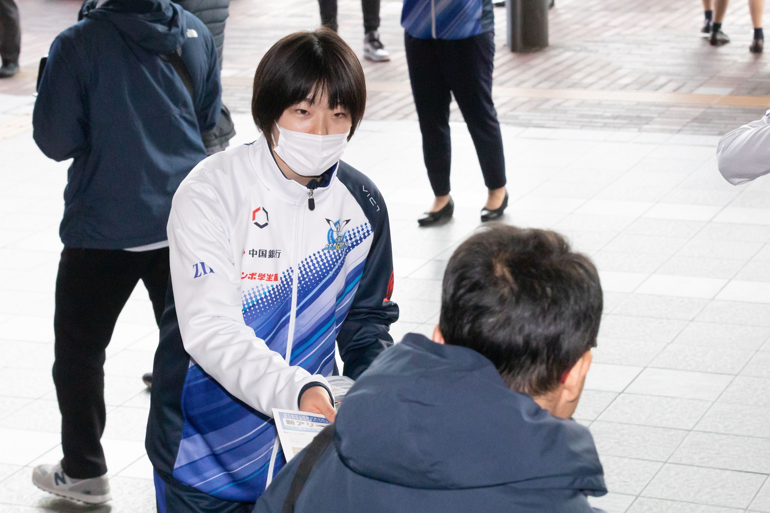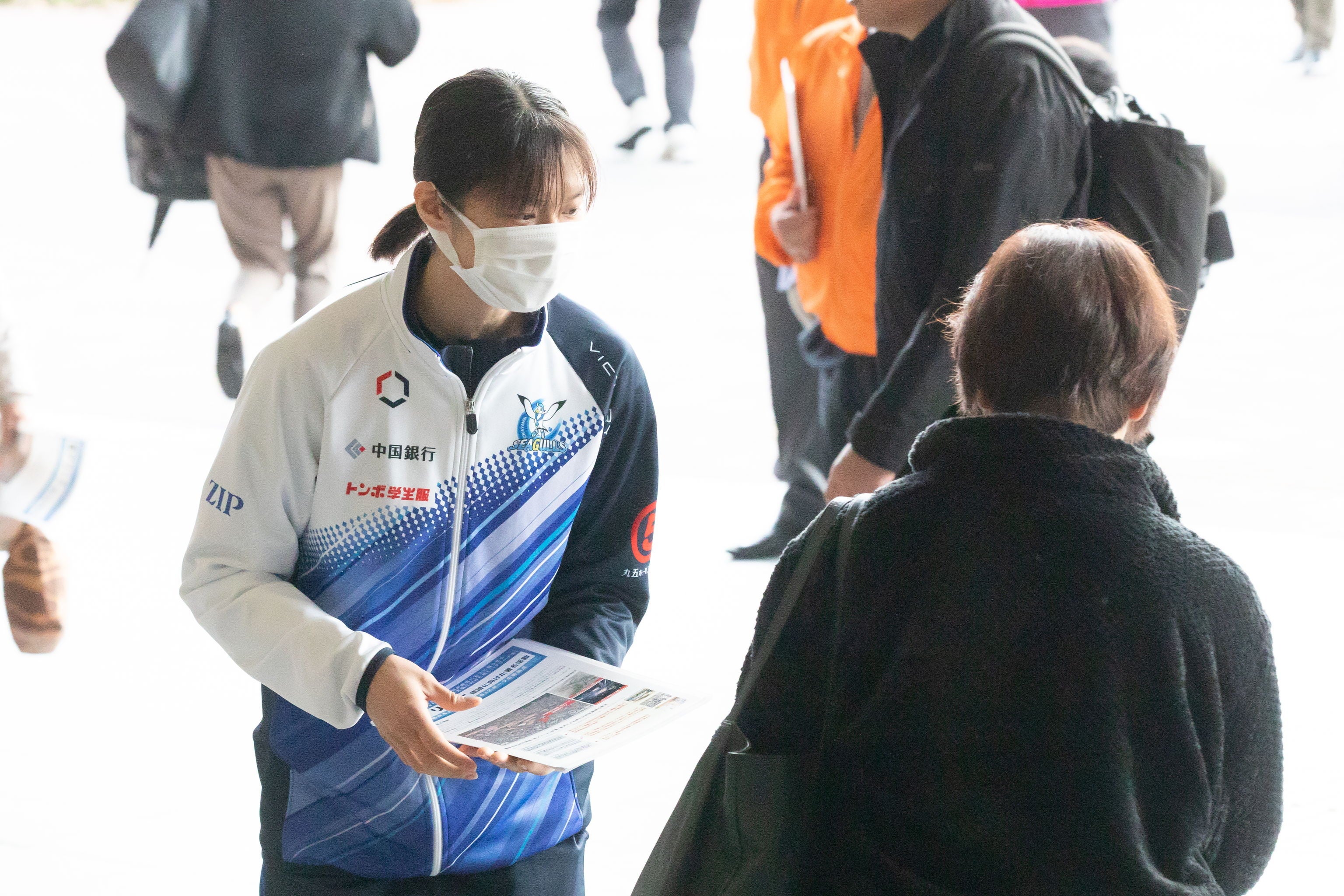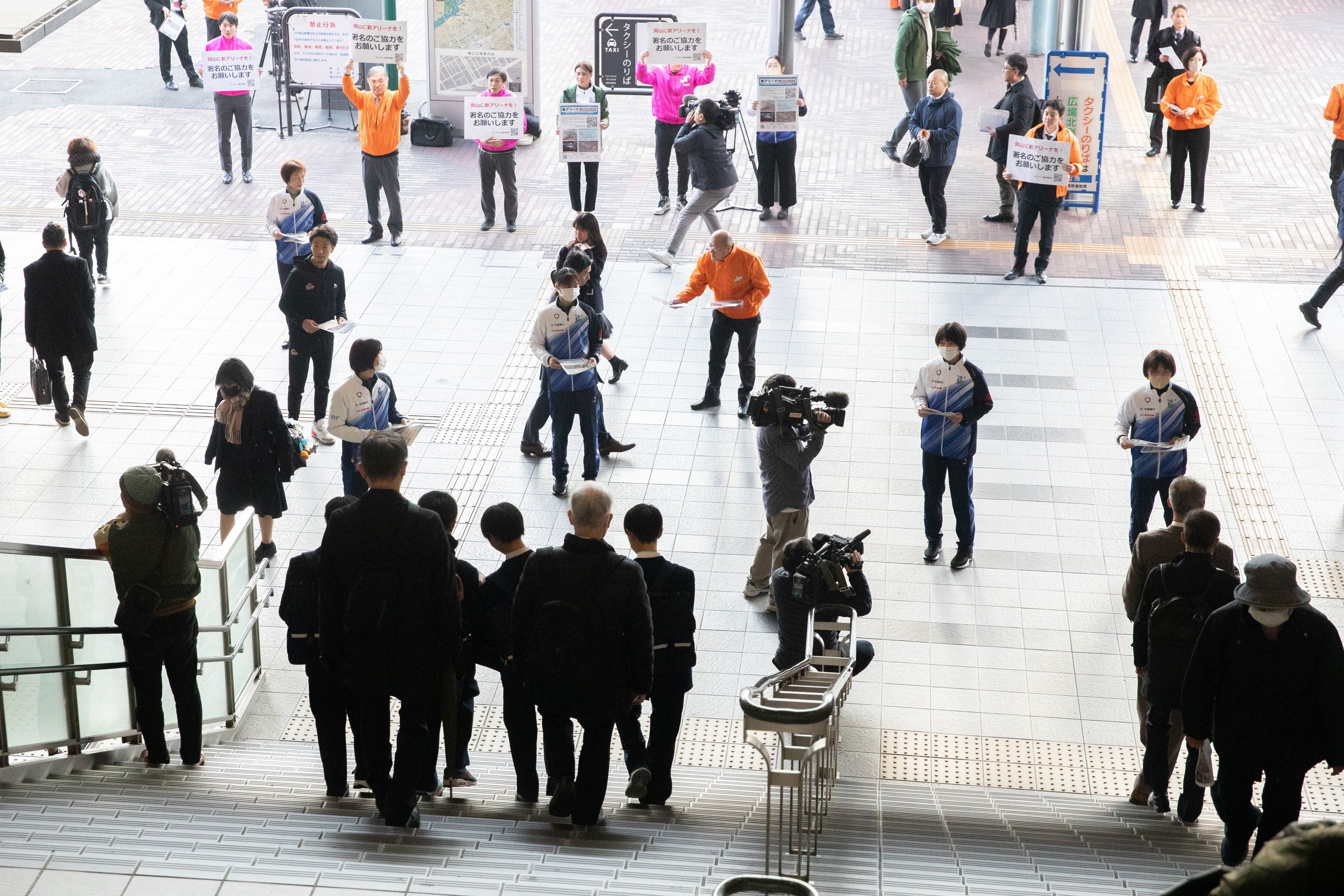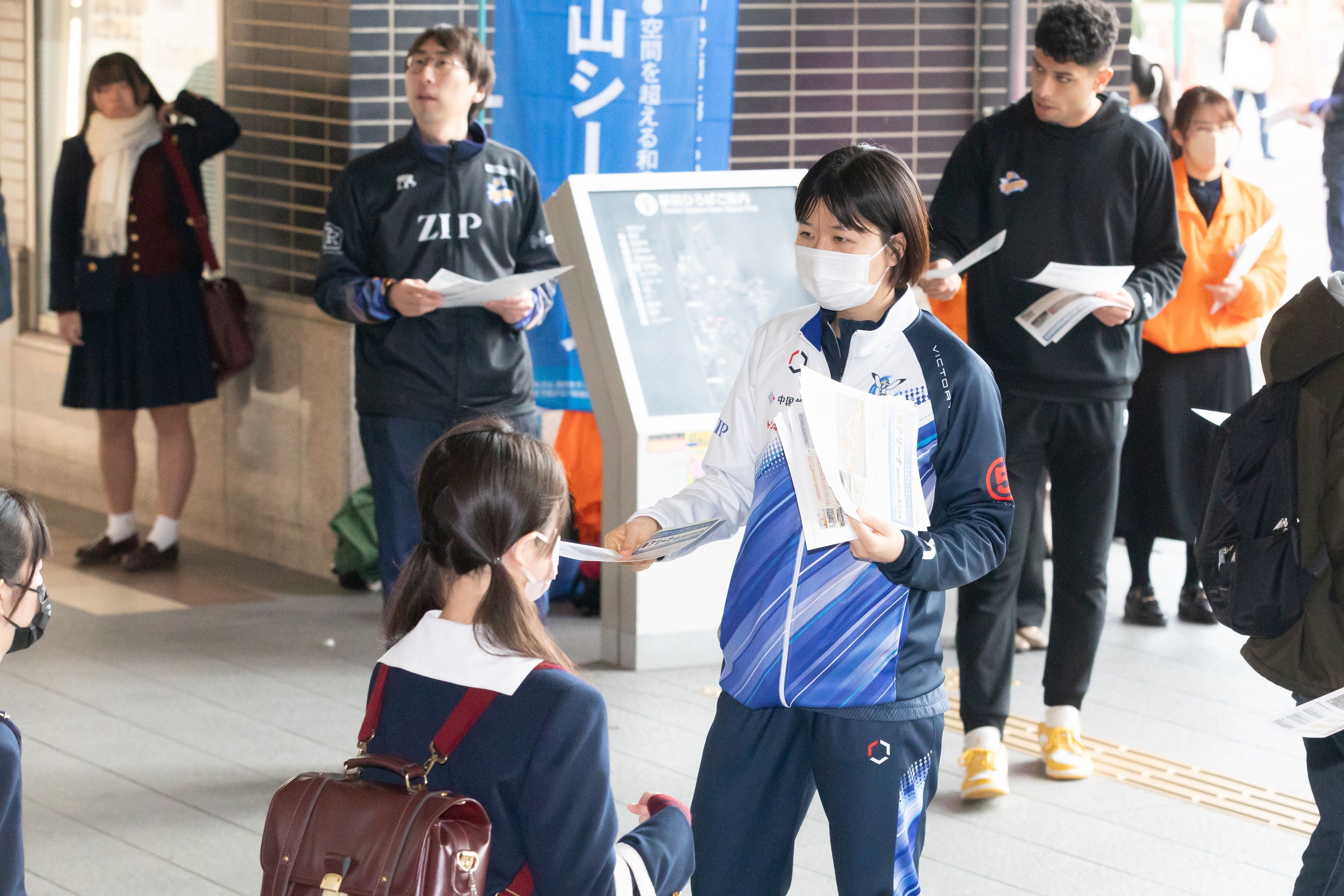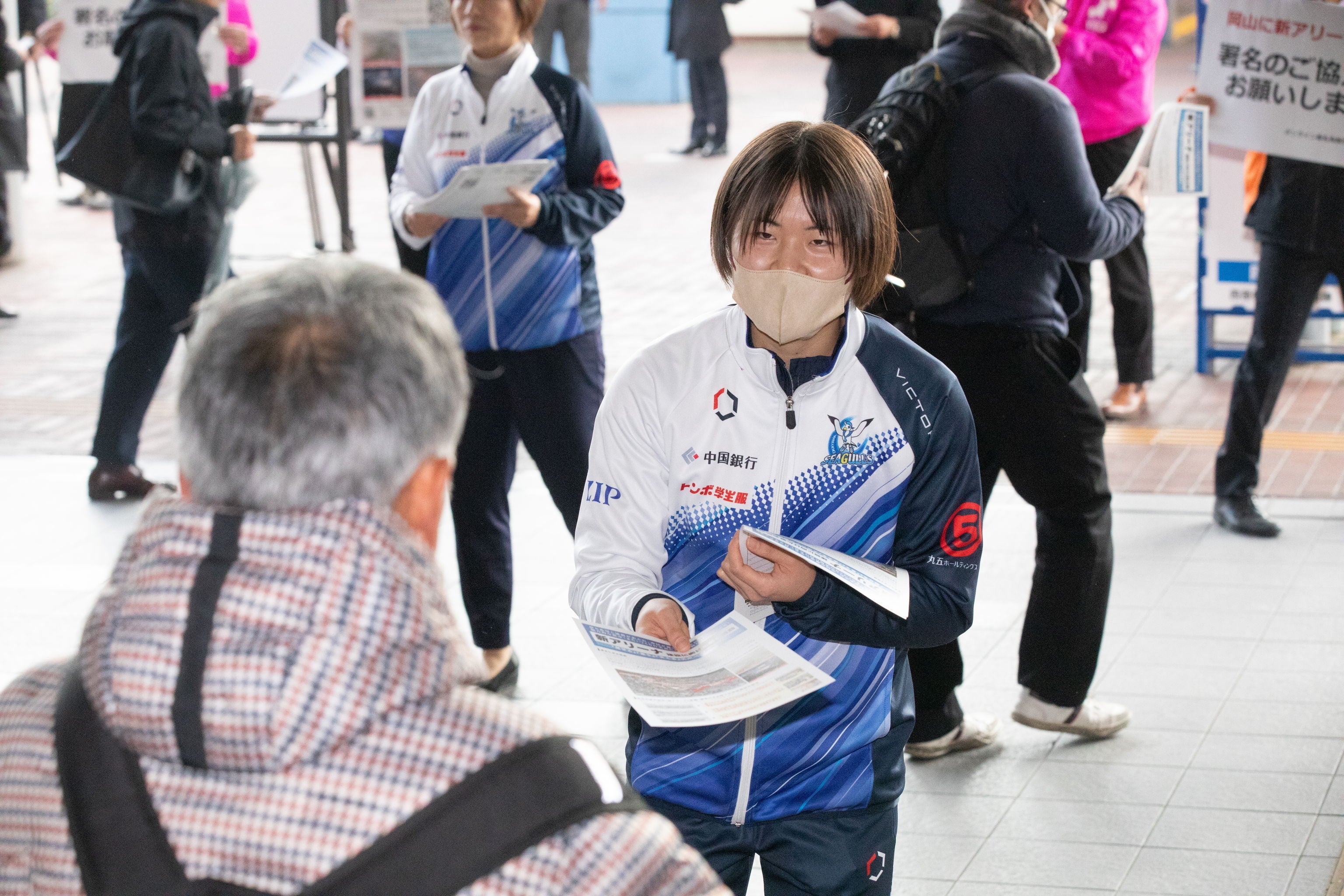岡山シーガルズからは宮下 遥選手・宇賀神 みずき選手・濱田 真友選手・妹尾 紗香選手らが朝の通勤・通学時間帯の岡山駅利用者に向けて署名へのご協力を呼びかけました。