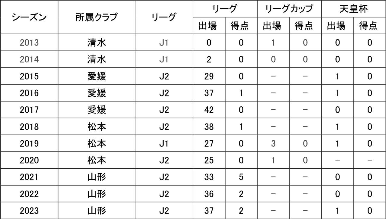 所属歴/名古屋FC – 藤枝東高 – 慶応義塾大 – 清水エスパルス – 愛媛FC – 松本山雅FC – モンテディオ山形
