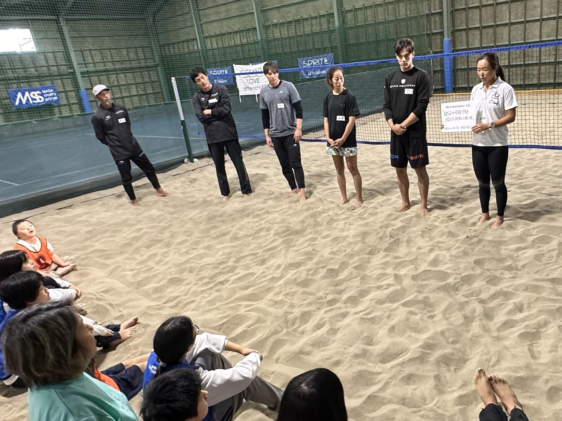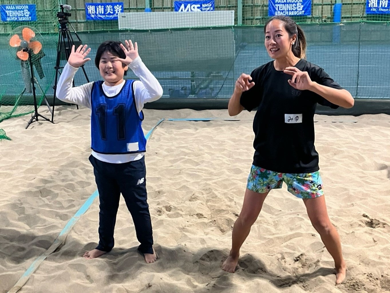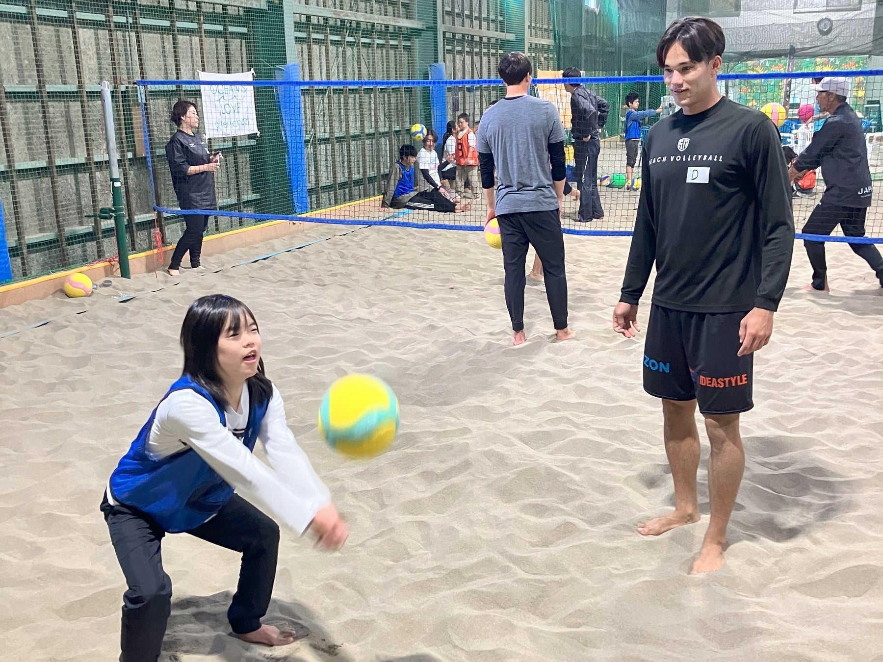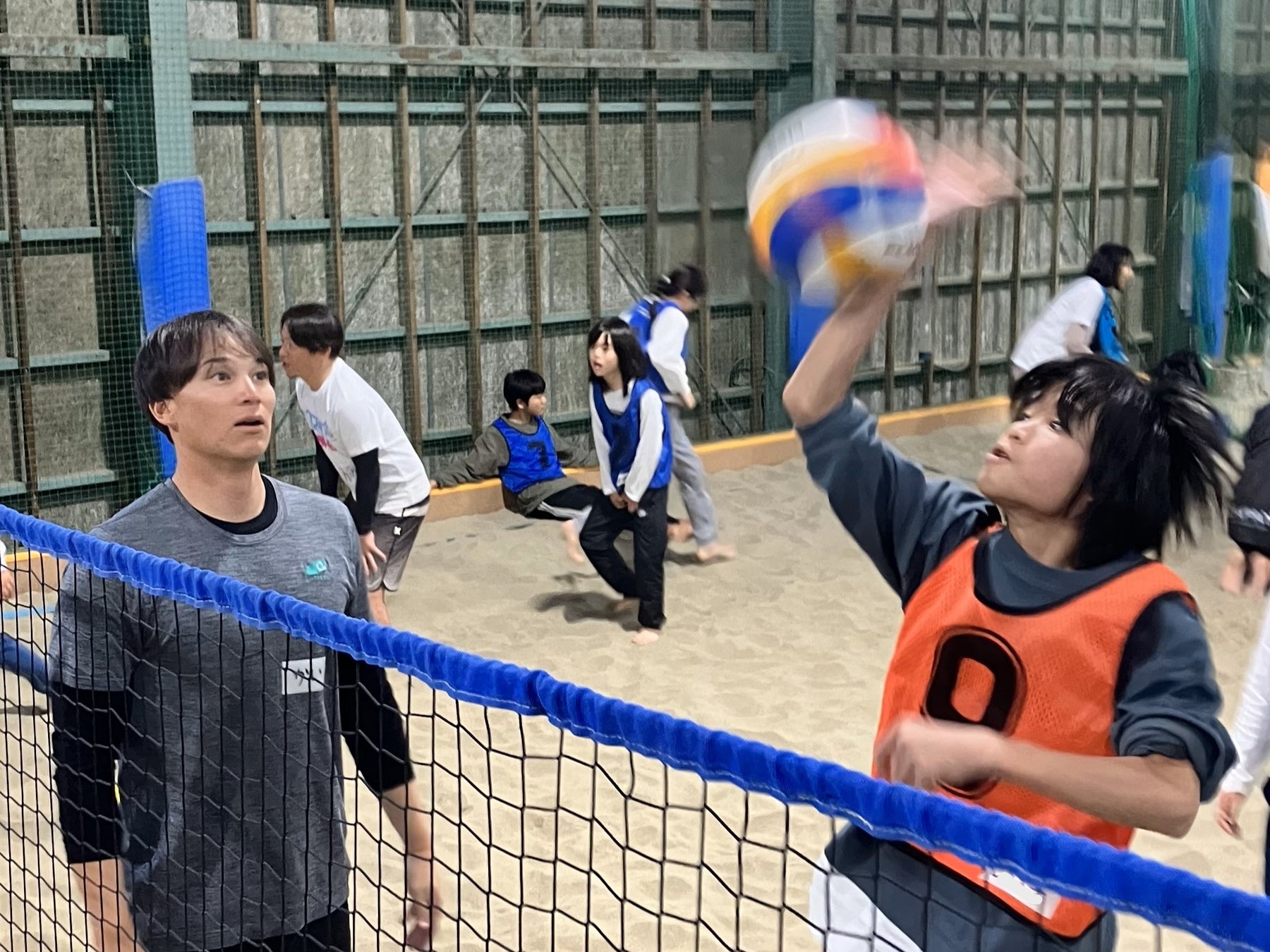 途中、ビーチバレーボールらしさを楽しむ砂に飛び込む練習もあり、子どもたちは元気いっぱいに砂の上で動き回っていました。