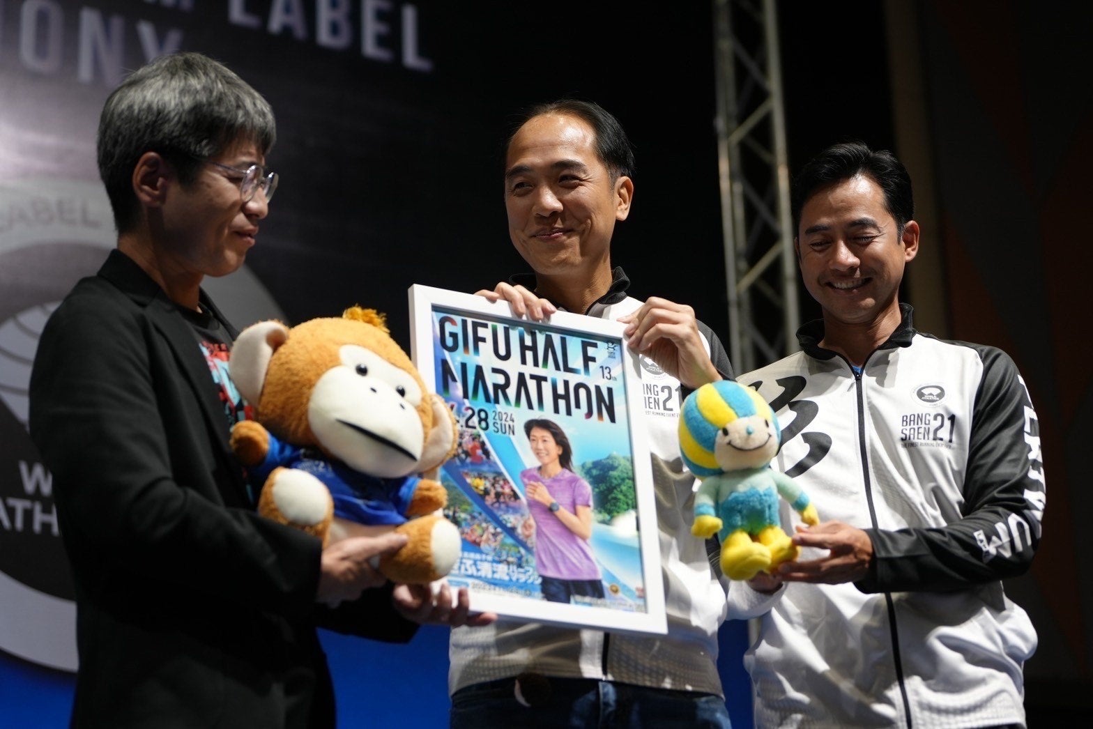 12月16日(土)のバンセン市内で開かれた大会前日イベントでは、ぎふ清流ハーフマラソンの実行員会がブースを出展し、ぎふ清流の魅力をPRしました。同日にあった記者発表では、バンセン21のレースディレクター、ラット・ジロワニチャコーンさんや、実行委の常任委員を務める岐阜県の堀寛臣地域スポーツ課長が登壇しました。記念としてバンセン21のキャラクターと、岐阜県のキャラクター「ミナモ」のぬいぐるみを交換しました。