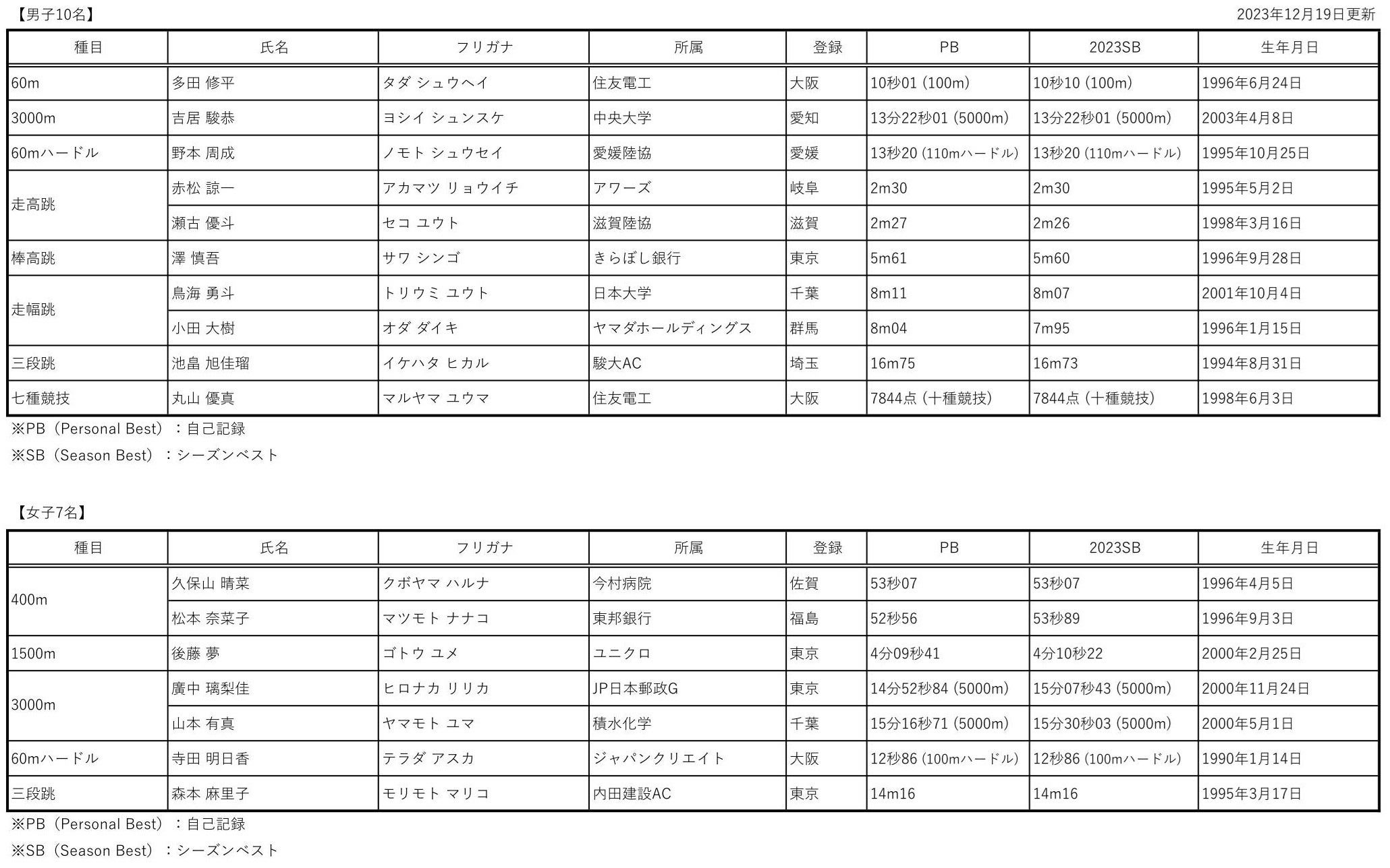 本大会には、ブダペスト2023世界陸上競技選手権大会 女子10000m7位入賞の廣中璃梨佳(JP日本郵政G)、男子走高跳8位入賞の赤松諒一(アワーズ)をはじめ、池畠旭佳瑠(駿大AC)、丸山優真(住友電工)、後藤夢(ユニクロ)、山本有真(積水化学)、寺田明日香(ジャパンクリエイト)、森本麻里子(内田建設AC)といった日本代表選手を含む全17名がエントリー。赤松、丸山は前回大会(アスタナ2023アジア室内陸上競技選手権大会)金メダリストとして今大会に臨みます。