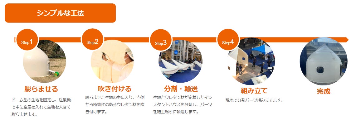 このたび、分割パーツによる組み立て方式を採用し、現地での設営時間は1~2時間、狭いスペースでも柔軟に設置や移動を可能にする新型都心モデル「インスタントハウス・パージ型」を新たに開発しました。膨らませる、吹き付ける、分割する、組み立てるというシンプルな工法により「施工~移設~組み立て」までの一連作業が約3日間で完了できるため、昨今建設業界で問題になっている人手不足の影響を受けることなく施工することが可能です。都心部での施工や移設が可能となり、都心部の遊休スペース活用の可能性が広がります。