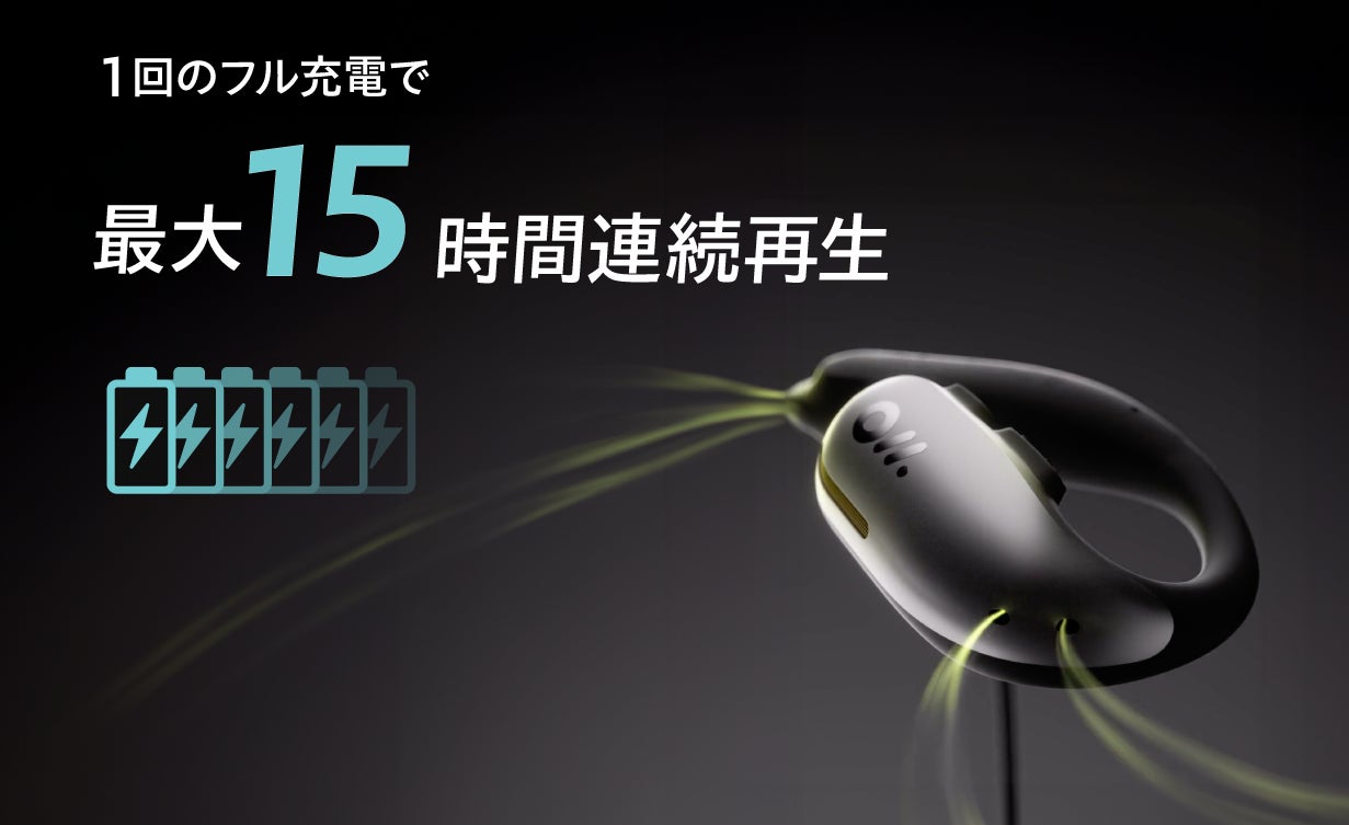 耳の裏側に位置するバッテリー部には、大容量150mAhのリチウムイオンバッテリーを搭載。製品単体で最大15時間再生が可能です。さらに15分の充電で最大5.3時間再生の急速充電にも対応しています。独自の省エネ技術「Energy Lock」により、バッテリーの消費電力を抑えながら、本体の軽量化(25.9g)を実現しました。