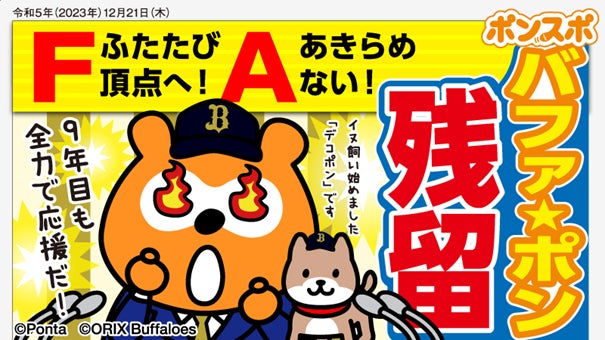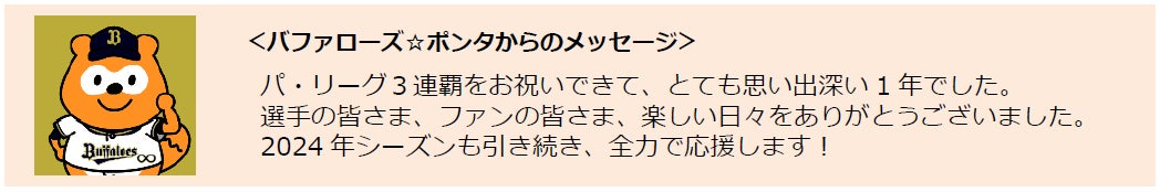 スポンサー8年目となった2023年シーズンは、ファンの皆様にバファローズ☆ポンタの世界観をお楽しみいただき、一緒に球団を応援する企画を実施しました。8月には京セラドーム大阪で「バファローズ☆ポンタDAY 2023」を開催し、多くの方にご来場いただきました。また、バファローズ☆ポンタ公式X(旧Twitter)@bs_ponta(https://twitter.com/bs_ponta/)では、2016年シーズンから累計で1000試合の応援を達成しました。「バファローズ☆ポンタ」は、2024年シーズンも引き続き、ファンの皆様とともに、オリックス・バファローズならびに野球界全体を全力で応援します。