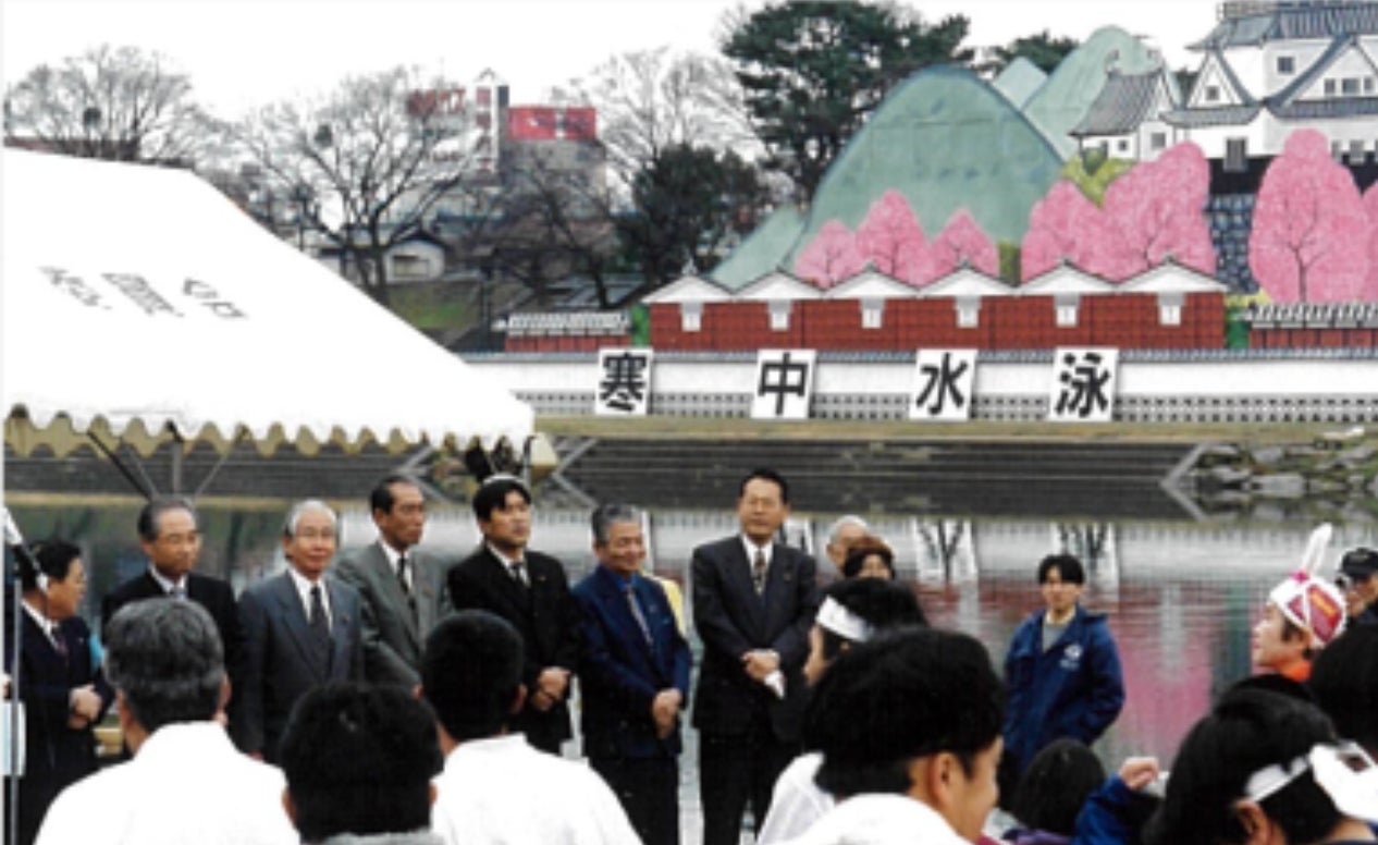 はじめて乙川で寒中水泳が実施されたのは74年前の昭和24年(1949年)です。小学校の教員が設立した岡崎水泳協会が主催で開催されました。その後、高度成長期による水質汚濁により中断されましたが、水質改善により復活を遂げ、岡崎竜城スイミングクラブ創設者の大森国臣を筆頭に以降開催が続いていました。しかし、7年前に乙川周辺の地区整備によりまたも中断。7年の時を経て、2024年に復活します。