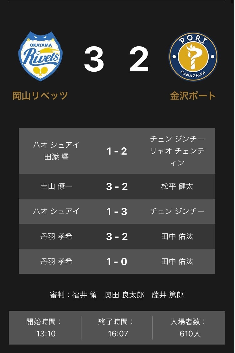 ホームプレスリリース ノジマ リーグ 2023-2024シーズン 公式戦 12月23日開催 岡山リベッツvs金沢ポート 試合結果 2023年12月23日 16時20分 公開|スポーツマニア編集部プレスリリース 一般社団法人Tリーグのプレスリリース 岡山リベッツと金沢ポートの試合は、3-2で岡山リベッツが勝利しました。