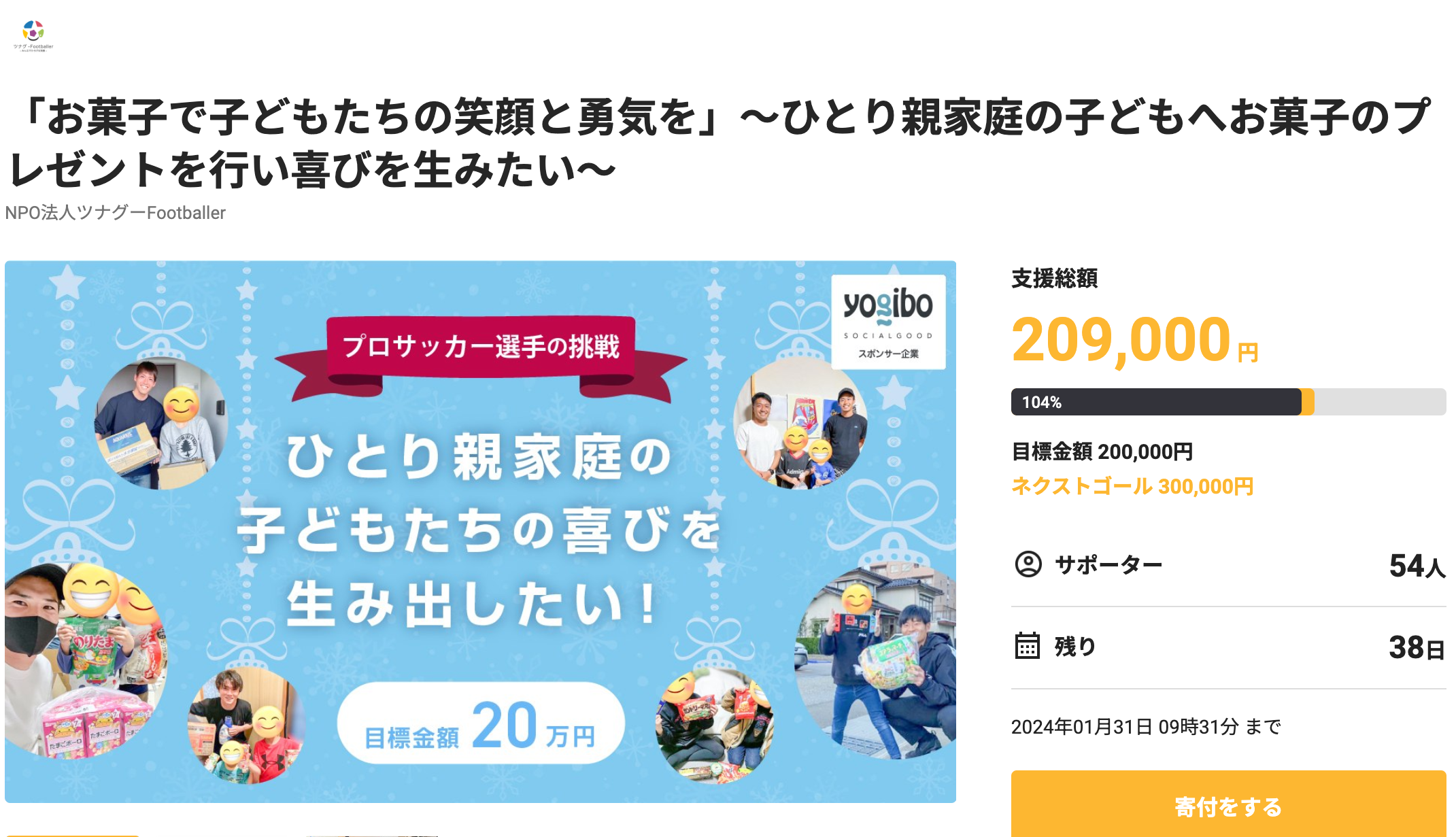 寄付決済サービスのコングラントが提供する寄付金が100%届くクラウドファンディング「GIVING100 by Yogibo」にて開始したクラウドファンディングで、開始から4日で目標金額を達成しました!