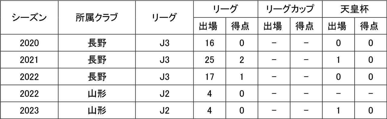 前所属/鳥山北FC – FCトッカーノU-15 – 市立船橋高校 – 新潟医療福祉大学 – AC長野パルセイロ – モンテディオ山形
