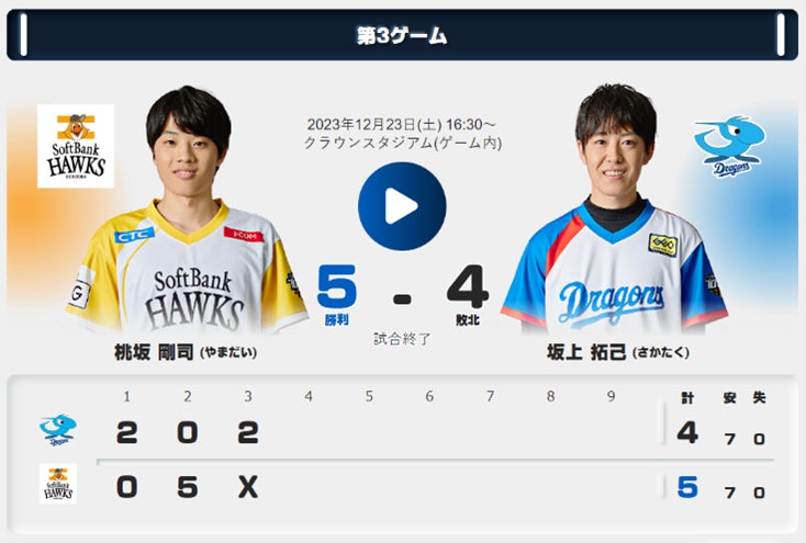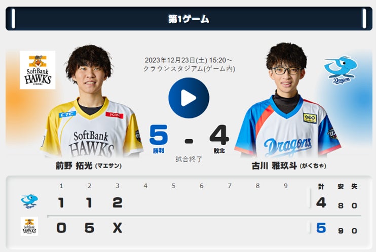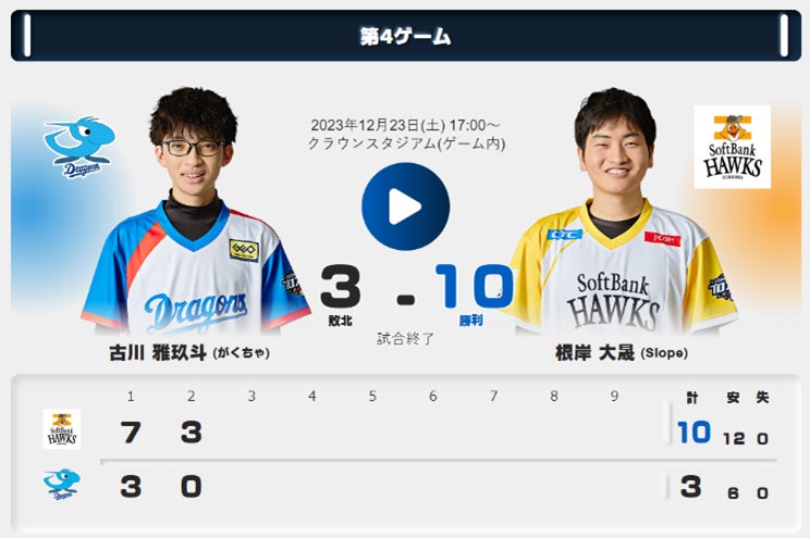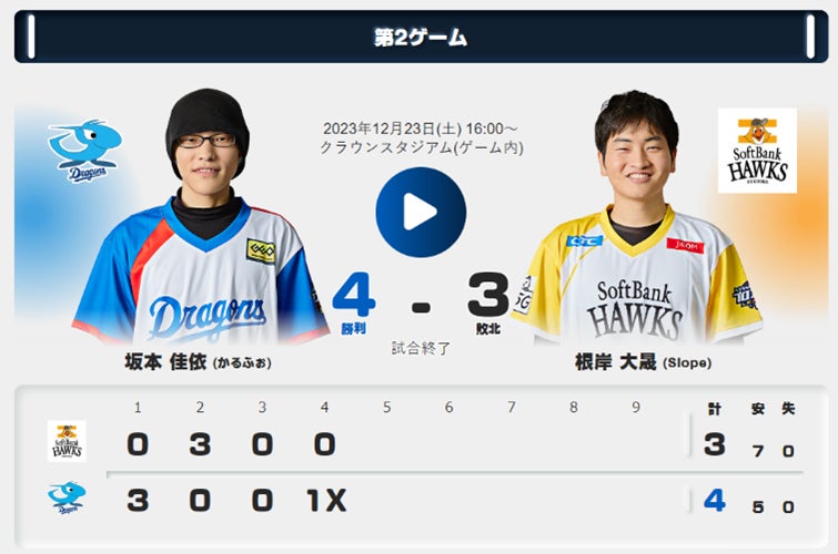 一般社団法人日本野球機構(NPB)と株式会社コナミデジタルエンタテインメントは、「eBASEBALLプロスピAリーグ」2023シーズンの最終戦「e日本シリーズ」を12月23日(土)に東京ドームシティプリズムホールで開催し、福岡ソフトバンクホークスが中日ドラゴンズを下し、2年連続の日本一に決定したことをお知らせします。