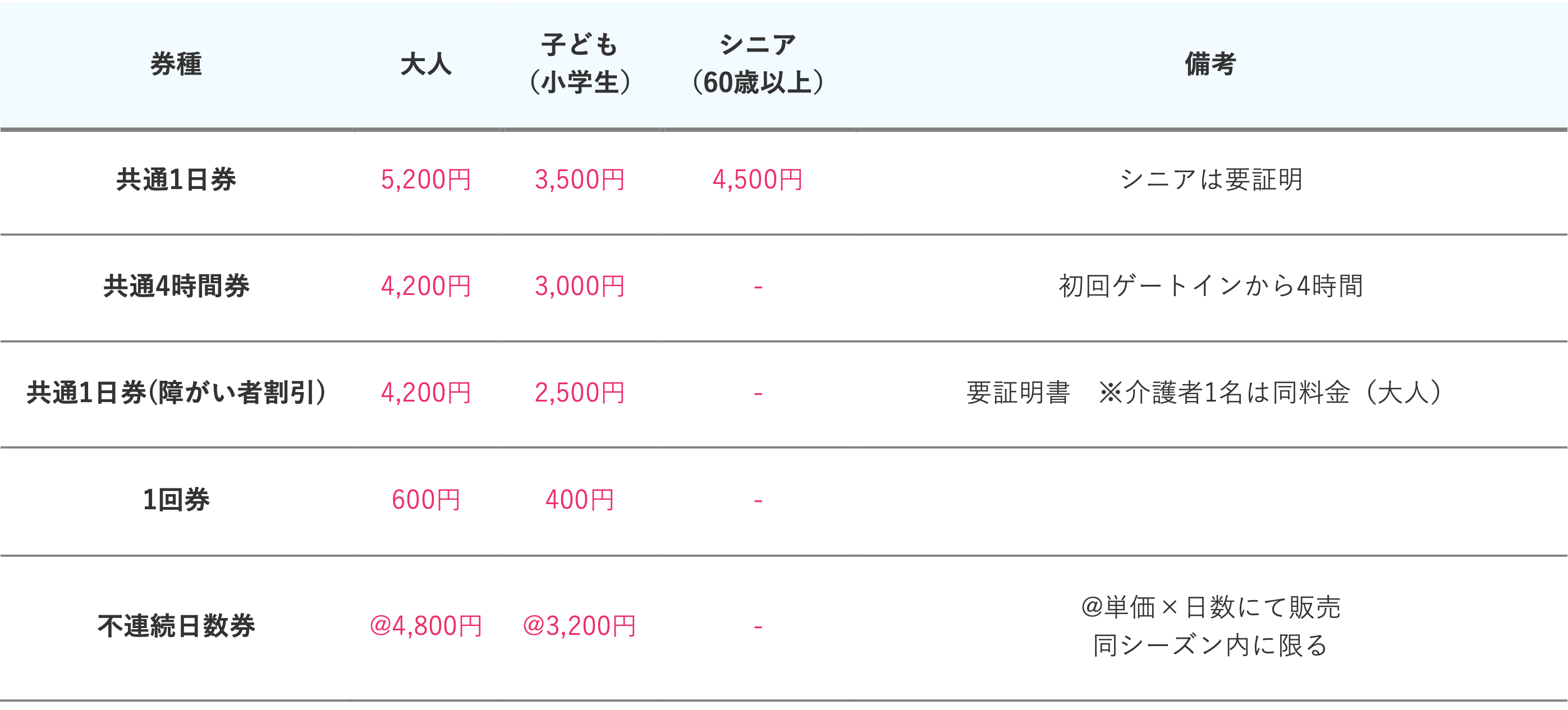 ※初滑りキャンペーン(オープン~12月下旬)と、春休みキャンペーン(3月下旬)の期間、1日券が大人3,500円、子ども2,000円となります。
