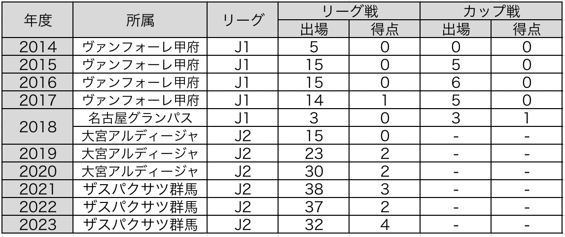 ジュニアコスモス城北 – 三菱養和巣鴨SS – 三菱養和巣鴨SC – FC東京U-18 – 早稲田大 – ヴァンフォーレ甲府 – 名古屋グランパス – 大宮アルディージャ – 名古屋グランパス – 大宮アルディージャ – ザスパクサツ群馬