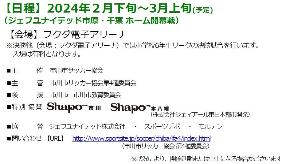 JR市川駅直結の「シャポー市川」とJR本八幡駅直結の「シャポー本八幡」は、 2013年度から市川市サッカー協会主催の「市川市少年サッカー親善大会」を応援しています。地域の子ども達の成長を見守り、地域になくてはならないショッピングセンターを目指し、2023年度も、引き続き同大会を応援していきます。
