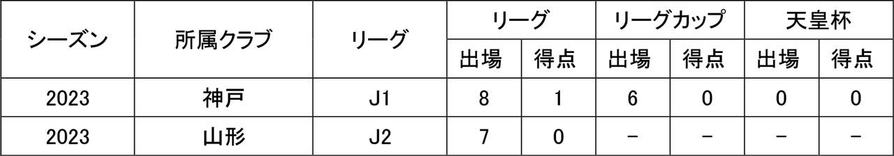 所属歴/八尾太陽リンクスSC – 柏田SC – ヴィッセル神戸U-18 – びわこ成蹊スポーツ大学 – ヴィッセル神戸 – モンテディオ山形
