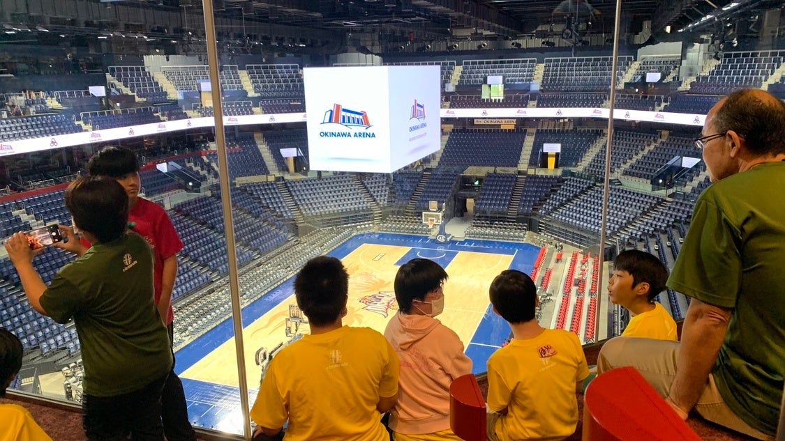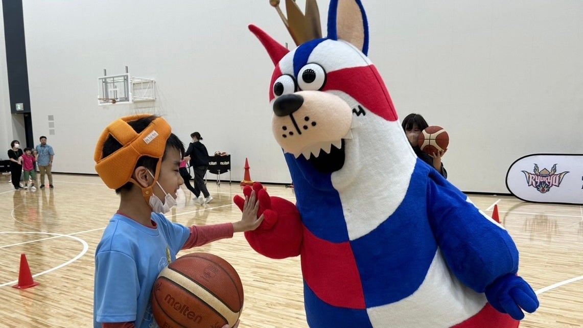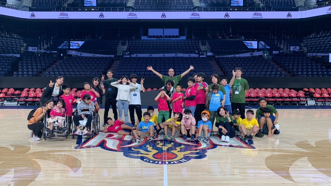 交流会では、沖縄アリーナ株式会社と沖縄スポーツアカデミー株式会社の協力のもと、沖縄アリーナの施設見学を行った後、サブアリーナにてバスケスクールコーチによるボール遊びやドリブルシュート、ゴーディーとの交流や記念撮影などを行いました。沖縄アリーナの魅力と、体を動かすことやバスケットボールの楽しさを体験していただきました。