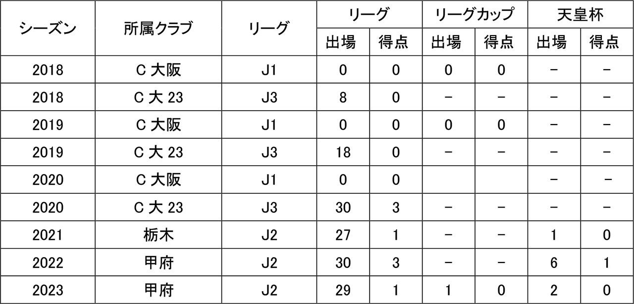所属歴/喜連東FC – セレッソ大阪U-15 – セレッソ大阪U-18 – 栃木SC – ヴァンフォーレ甲府