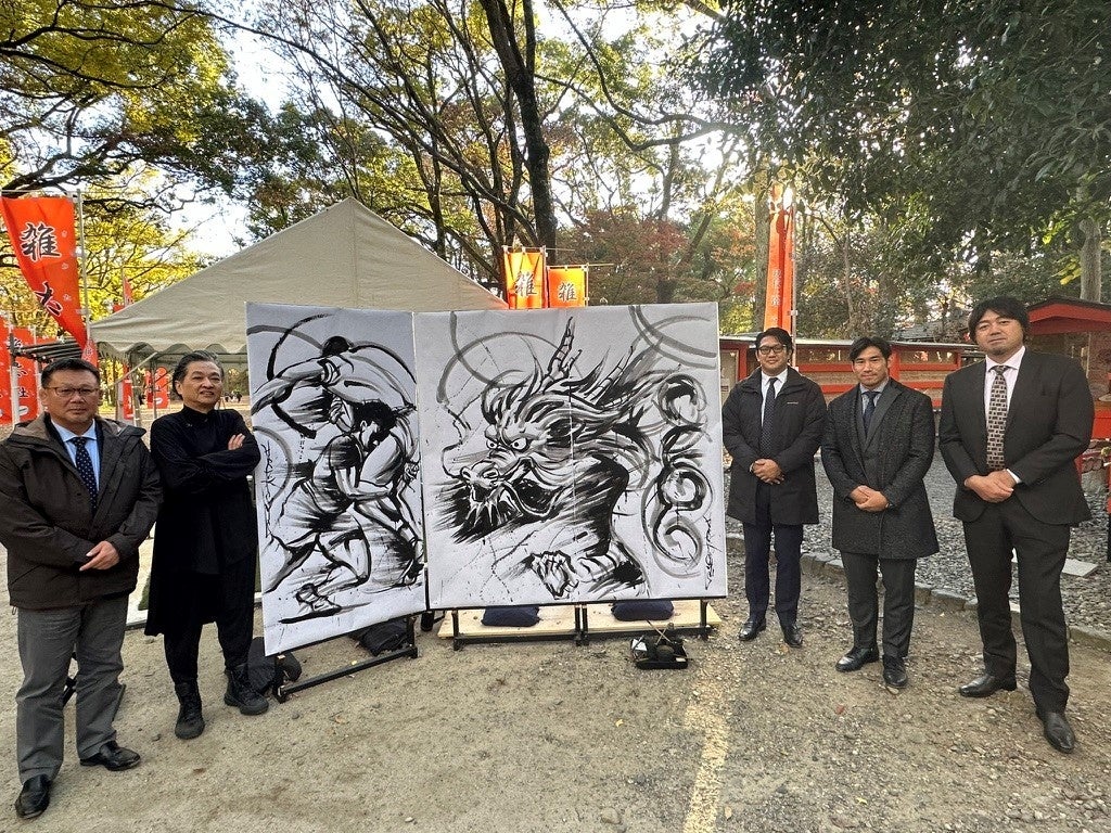 また祈願祭が行われた12月3日には御朱印の墨絵原画を作画した茂本ヒデキチ氏による奉納ライブペイントが行われラグビー界のレジェンドと参拝者を前に披露された。