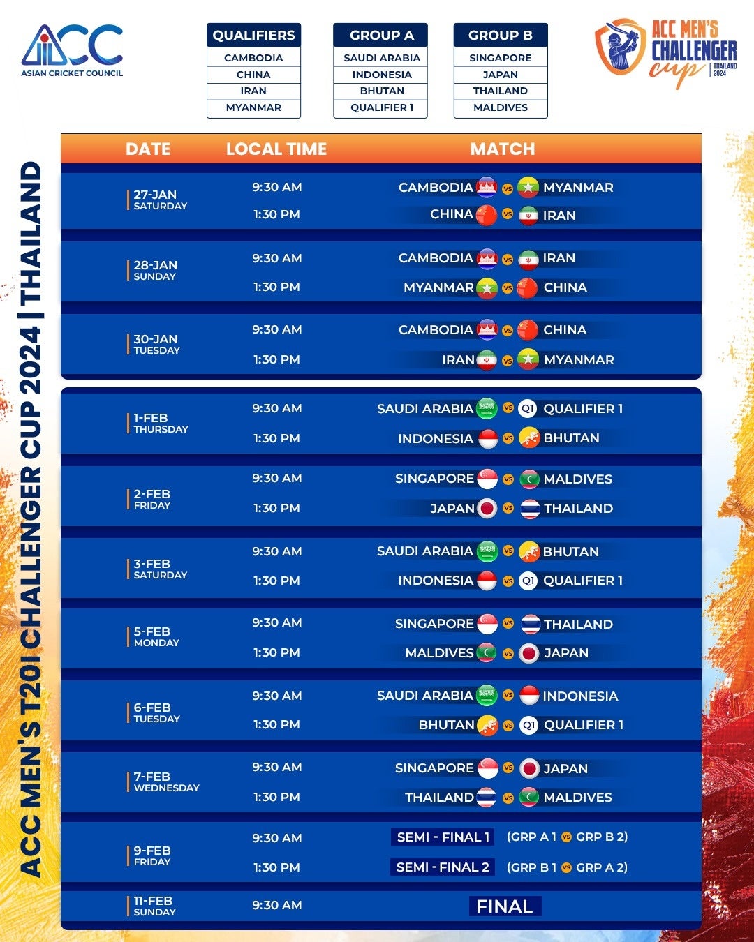 チャレンジャーカップは、カンボジア、中国、イラン、ミャンマーの4チームによる予選を勝ち抜いた1チームと、インドネシア、サウジアラビア、シンガポール、タイ、日本、ブータン、モルディブの計8チームが2つのグループに分かれて対戦します。それぞれのグループの上位2チームによる準決勝に勝利した2チームが、アジアカップ最終予選となるACC男子プレミアカップへの出場権を獲得します。グループリーグは2月1日から7日、準決勝は2月9日、決勝は2月11日に開催される予定です。試合は全てバンコクのTerdthai Cricket Groundで開催される予定です