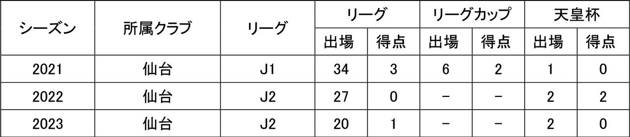 所属歴/尾山台サッカークラブ – ヴィトーリア目黒FC – ヴェルディS.S.アジュント – 流通経済大学付属柏高校 – 流通経済大学 – ベガルタ仙台