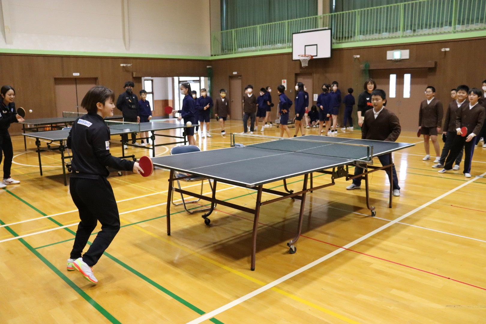 2023年11月29日には、日本ペイントグループの工場がある岡山県内にて、こども卓球台を寄贈するとともに卓球教室を開催しました。大藤沙月選手と打浪優アンバサダーのデモンストレーションでは、目を丸くするようなスマッシュの速さや曲がるサーブに児童だけではなく先生方も思わず「うわーすごい!」と声をあげプロの技に舌を巻いていました。卓球教室で実際に打ってもらうと、最初はボールに当たらず苦戦している様子でしたが、アドバイスをするとすぐにボールに当たるようになり、台の中にも返せるようになりました。中にはコツを掴んで大藤選手から「めっちゃうまい!」と言われて思わず笑みをこぼす児童も。もっと打ちたい!もっと練習したい!と言ってくれる児童も多く、休憩時間も卓球台で打ったり、壁に向かってボールを打ったりとすっかり卓球に夢中になってくれたようです。