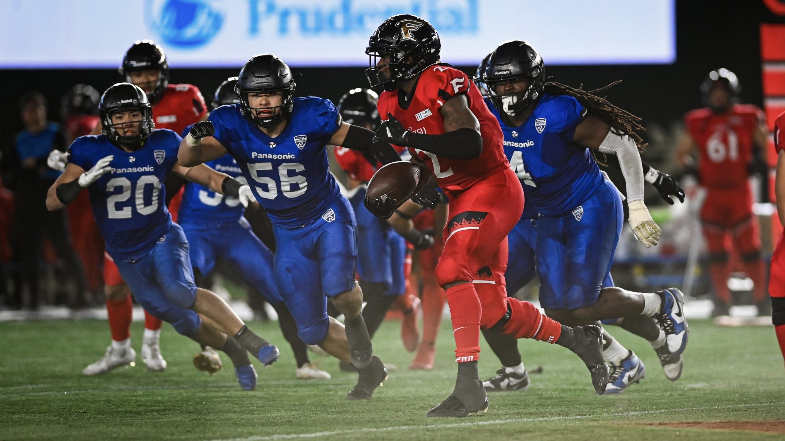 その後はこう着状態が続きスコアボードは動かなかったが、パナソニックは第2クオーター序盤にディフェンスバック(DB)ジョシュア・コックスのインターセプトが決まり自陣45ヤードで攻撃権を奪取。第1クオーターは鳴りを潜めていたRB立川玄明やミッチェルビクタージャモーのランを軸に敵陣奥深くまで歩を進めると、ゴール前1ヤードではRB立川が頭から突っ込みタッチダウン。パナソニックはトライのキックも決めて、試合を振り出しに戻した。