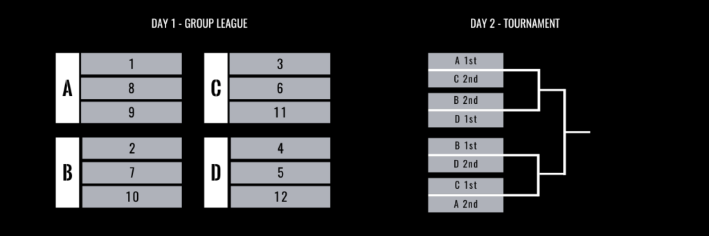 - Day1:3チーム×4グループによる総当りのグループリーグ戦