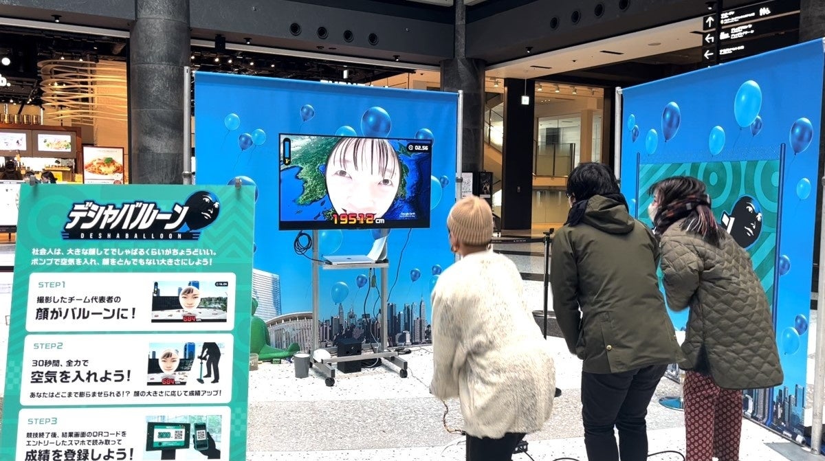 自転車の空気入れのようなポンプを全力で押すと、チーム代表者の顔を取り込んだ顔型バルーンに空気が入り、顔がどんどん膨らんでいきます。制限時間30秒で膨らませられた顔型バルーンの大きさに応じて、得点をゲットできます。最初はグランフロント大阪を象徴する屋外スペース「うめきた広場」からスタートし、大きくなるとJR大阪駅が見え、頑張れば宇宙に行くこともできます。自分の存在感をアピールしたくなるでしょう。