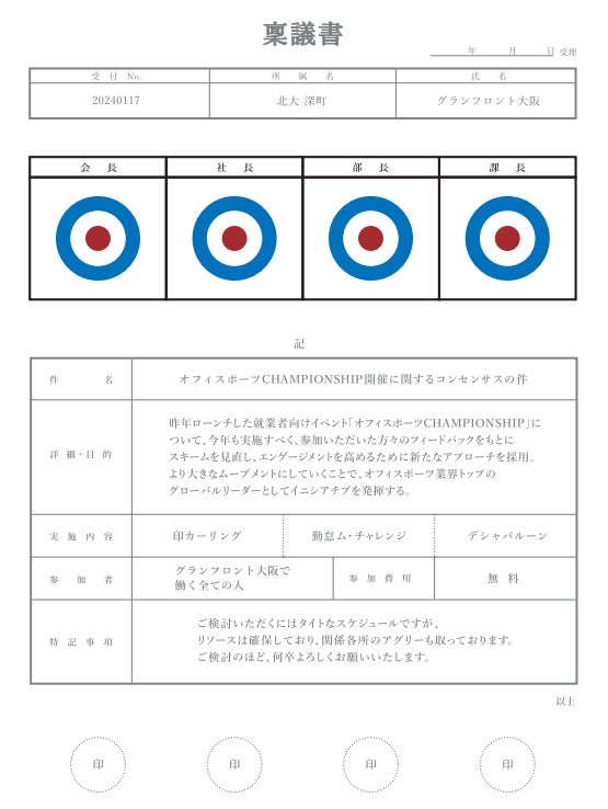 株式会社カヤック(本社:神奈川県鎌倉市 代表取締役:柳澤大輔)は、2024年1月17日(水)よりJR大阪駅直結の大規模複合施設「グランフロント大阪」で開催するテナント就業者向けイベント「オフィスポーツCHAMPIONSHIP」の企画・制作を行いました。対象は入居する500以上のテナントの就業者約2万人。チーム別、会社/店舗別でそれぞれ競い合い、テナント間のコミュニケーション活性化に役立てます。競技はお仕事にちなんだ3種目。2023年2月に初開催し、好評だった「印カーリング」、「デシャバルーン」、そして今回初登場の「勤怠ム・チャレンジ」です。人と人とのつながりを深めるきっかけにしていただくことはもちろん、体を動かすことで健康経営にも寄与したいと考えています。