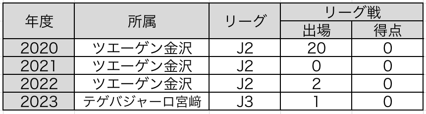 IRIS生野U-15 – 興國高校 – ツエーゲン金沢 – おこしやす京都AC(育成型期限付き) – ツエーゲン金沢 – テゲバジャーロ宮崎(期限付き)