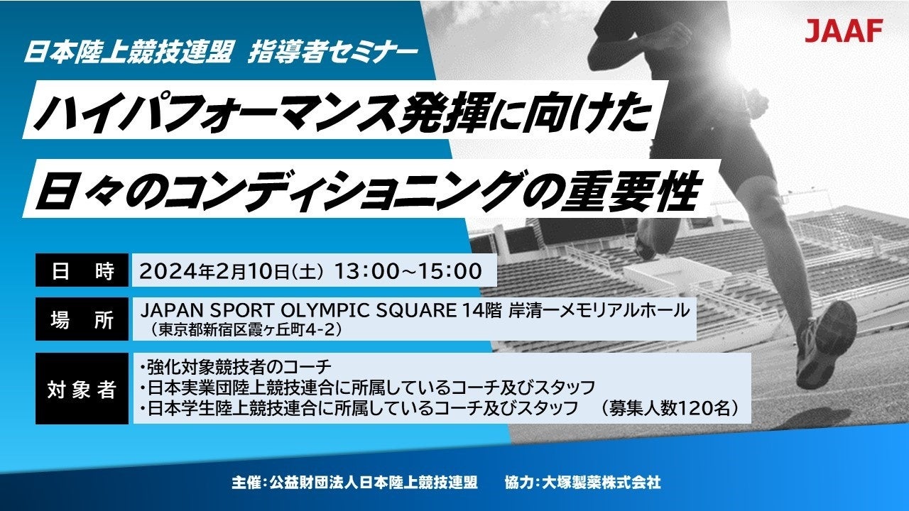 公益財団法人日本陸上競技連盟は、本連盟オフィシャルスポンサーである大塚製薬株式会社の協力のもと、トップ選手を指導するコーチ・スタッフ(強化対象競技者、日本実業団陸上競技連合、日本学生陸上競技連合)を対象としたセミナー『ハイパフォーマンス発揮に向けた日々のコンディショニングの重要性』を2024年2月10日(土)にJAPAN SPORT OLYMPIC SQUARE 14階 岸清一メモリアルルーム(東京都 新宿区)にて開催します。