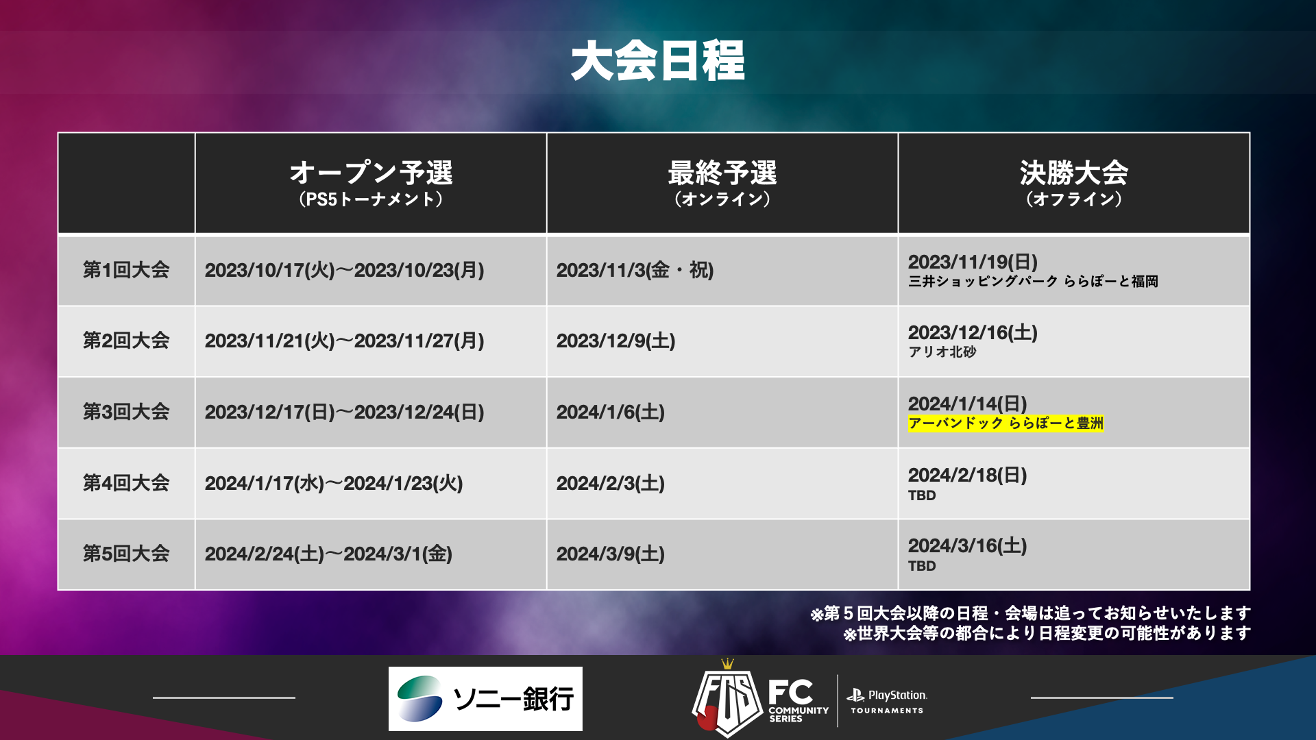 最終予選にて上位6人までに入賞した選手は、オフライン決勝大会への出場権を獲得します。決勝大会は東京都内を中心に全国各地で開催予定で、出場選手へは「FCS24」大会運営であるスポーツITソリューションから移動交通宿泊費の全額が補助されます。