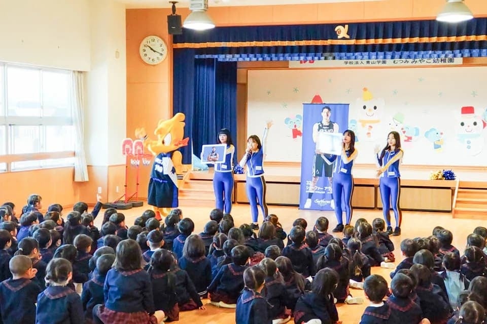 2024年1月9日(火)、シーホースくんとSuper GirlsのKAHO、MIYUU、TOMOMI、YUKIがむつみみやこ幼稚園(岡崎市)を訪問し、園児の皆さんと一緒にクイズやダンスを楽しみました。