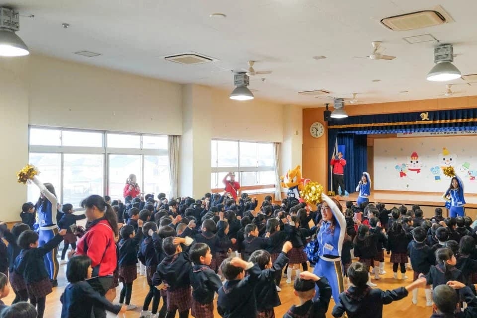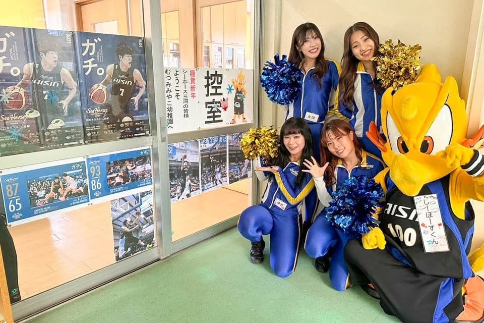 2024年1月9日(火)、シーホースくんとSuper GirlsのKAHO、MIYUU、TOMOMI、YUKIがむつみみやこ幼稚園(岡崎市)を訪問し、園児の皆さんと一緒にクイズやダンスを楽しみました。