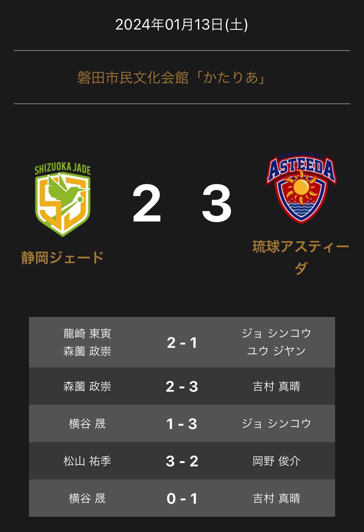 ホームプレスリリース ノジマTリーグ 2023-2024シーズン 公式戦 1月13日開催 静岡ジェード vs 琉球アスティーダ 試合結果 2024年01月13日 15時30分 公開|スポーツマニア編集部プレスリリース 一般社団法人Tリーグのプレスリリース ノジマTリーグ 2023-2024シーズン 公式戦 1月13日開催 静岡ジェード vs 琉球アスティーダの試合は3-2で琉球アスティーダが勝利しました。