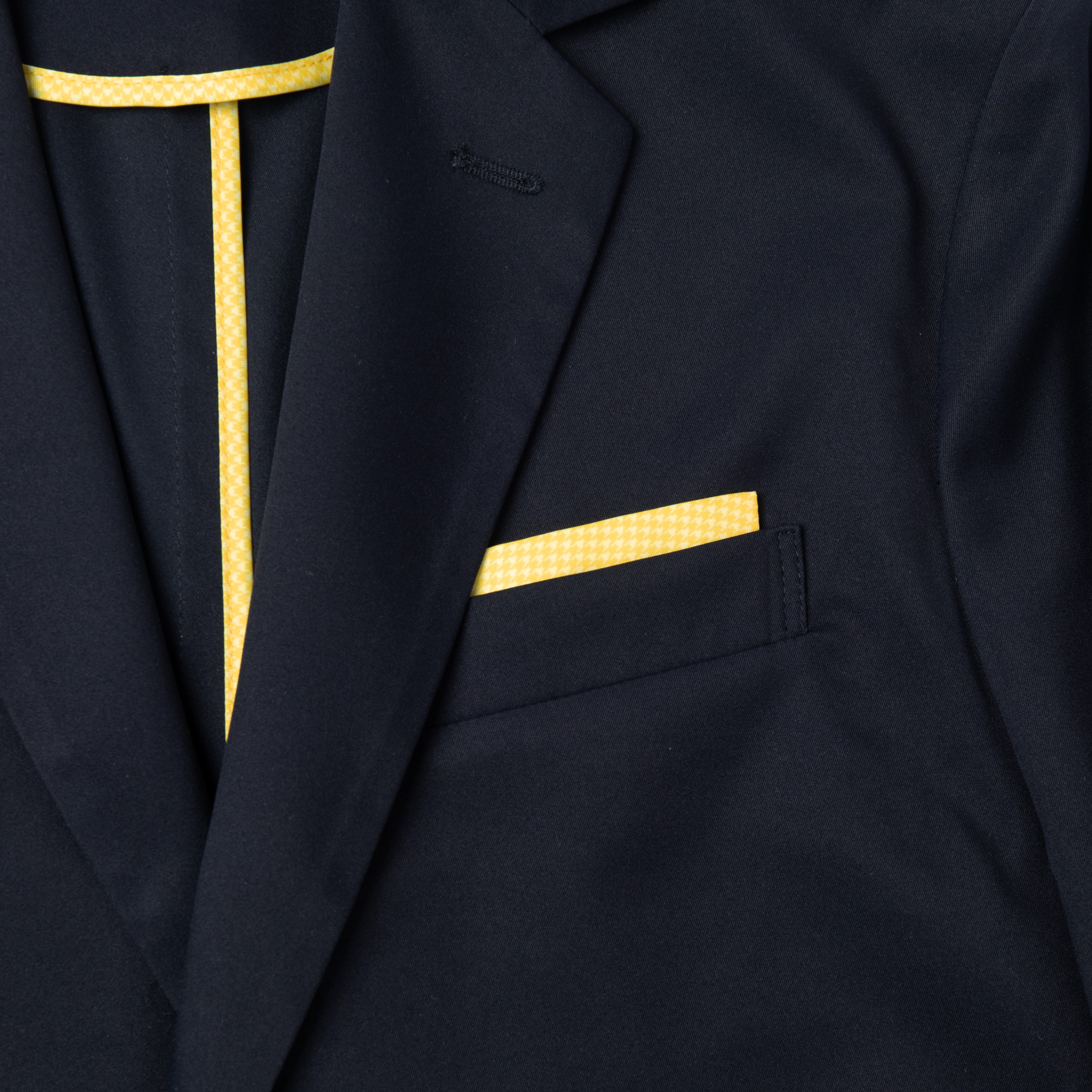 本商品は、栃木SCの選手・スタッフだけでなく、事前アンケートによりサポーターの要望も反映したデザインとなります。栃木SCのチームカラーのイエローをアクセントカラーに使用。胸ポケットのフェイクチーフやパイピングに、勝運祈願の意味を持つイエローと白の千鳥柄を採用しました。着用した際に身体にフィットするような立体感のあるシルエットに仕上げ、ビジネスシーンでもご着用いただけます。さらに、以前より要望の多かったレディース用スーツも製作しました。