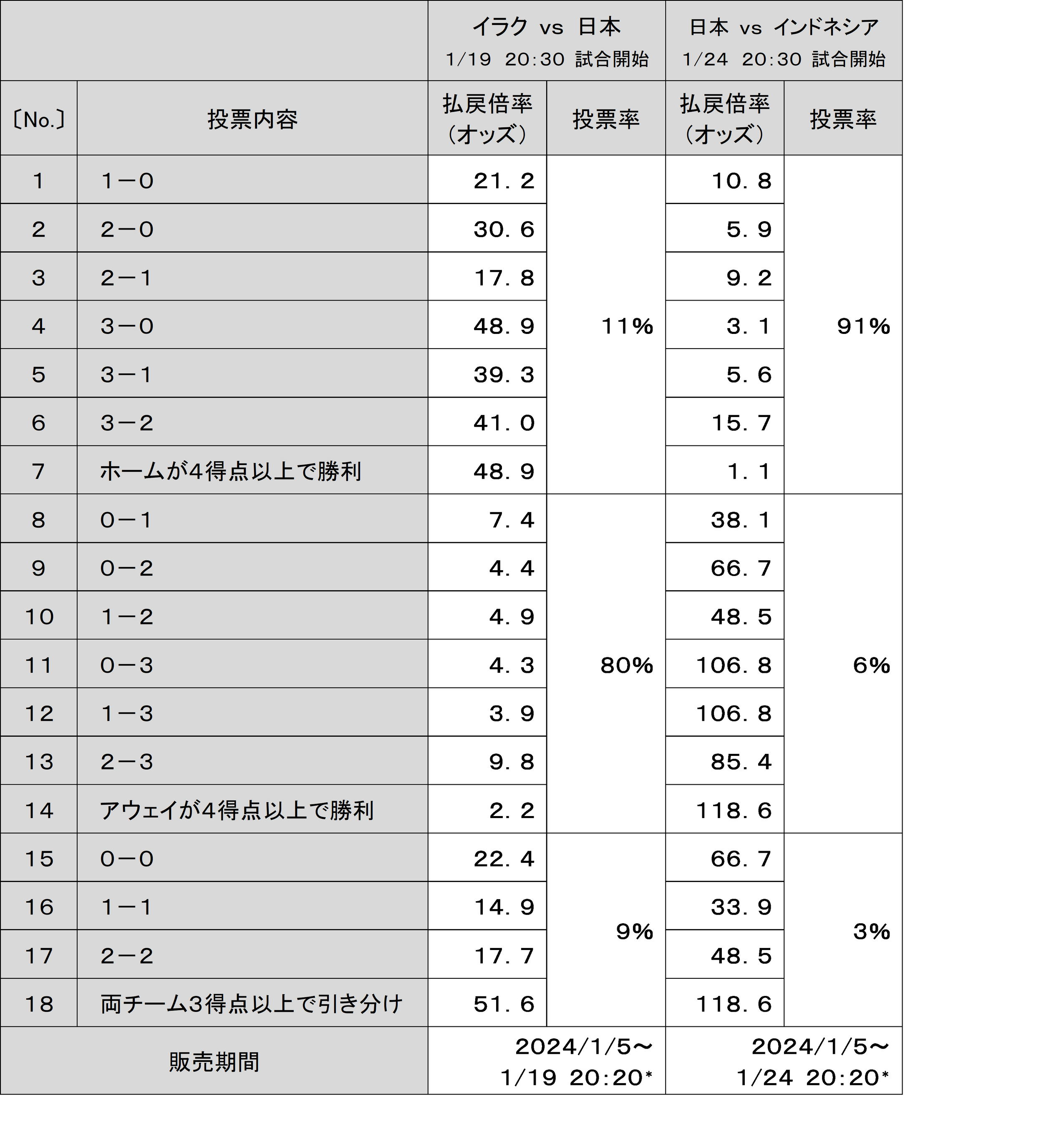 ・1月19日(金)開催予定の第2戦(vs イラク)、日本の勝利予想は、80%※2。1番人気の投票は、4得点以上で日本勝利で、払戻倍率(オッズ)は2.2倍!