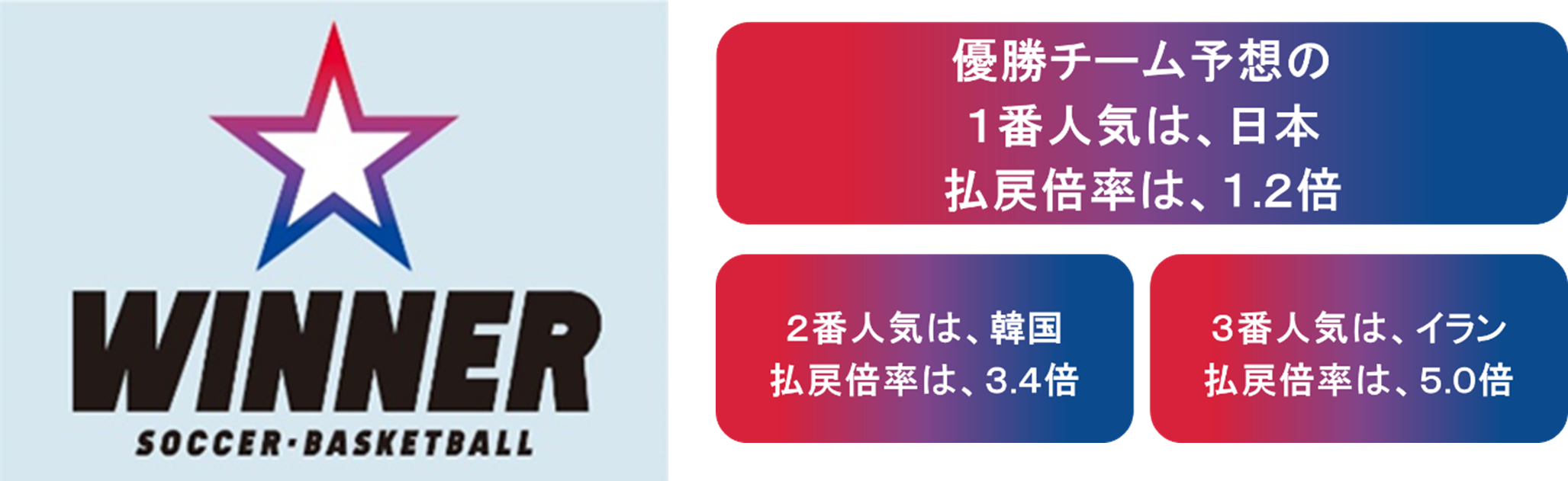 優勝チーム予想の1番人気は日本で、払戻倍率(オッズ)は1.2倍。2番人気は、韓国で、払戻倍率(オッズ)は3.4倍。3番人気は、イランで、払戻倍率(オッズ)は5.0倍。前回大会優勝のカタールは5番人気で、払戻倍率(オッズ)は6.3倍。