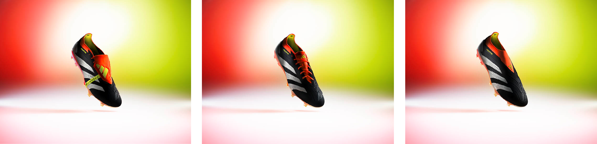 また、シュート時により強いインパクトを生み出せるよう、重量やグリップ力にもアップデートを施し、試合を決めるゴールのために生み出されたスパイクとなっています。重量については190g(プレデター ELITE LL FG、27.0cm片足)と、これまでのプレデターシリーズの中で最も軽いモデルへと昇華しました。レースモデルやレースレスモデルはもちろん、アイコニックなフォールディングタンを施した3つのバリエーションで展開します。