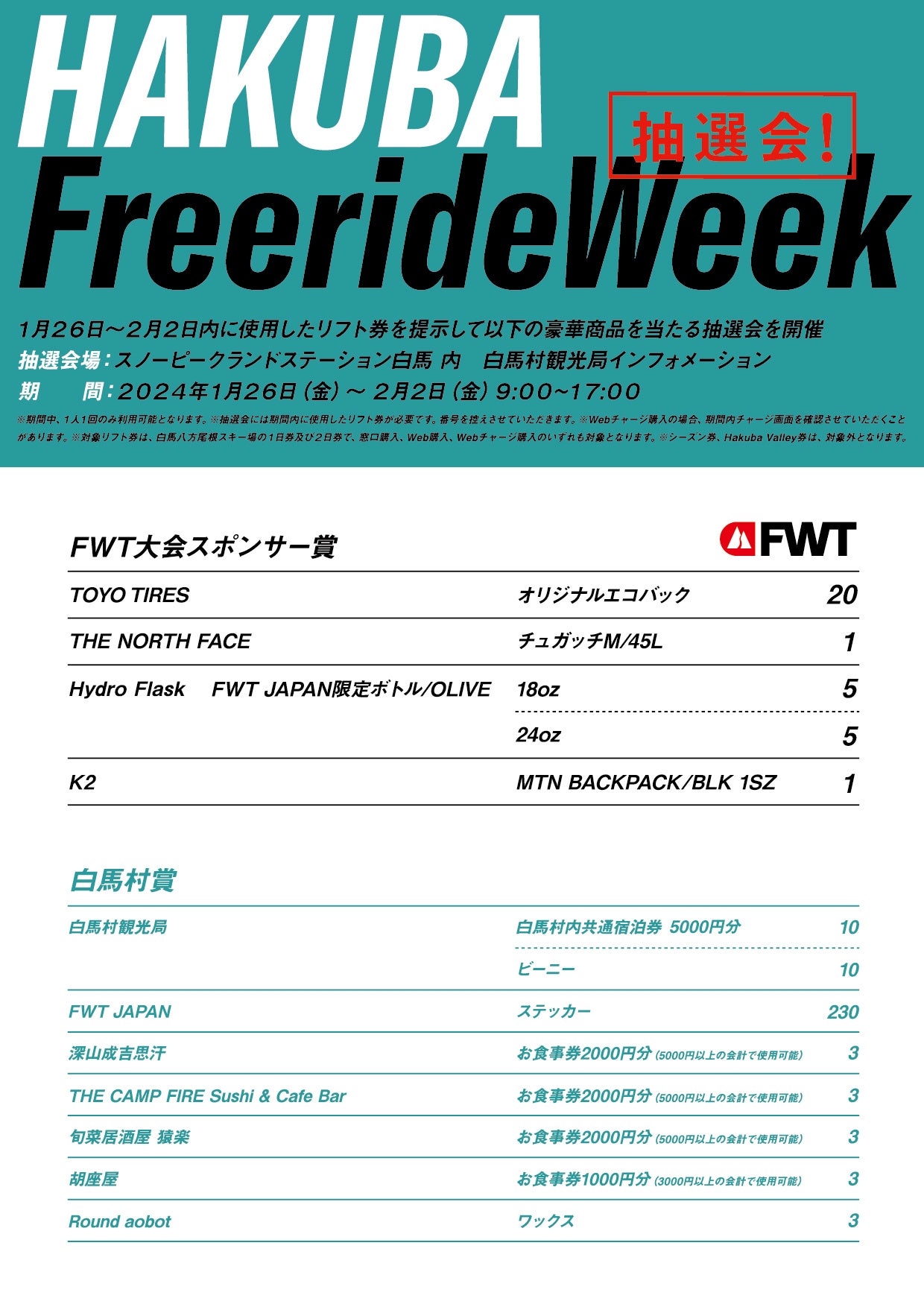 2024年1月26日(金)〜2月2日(金)の一週間を「HAKUBA Freeride Week」とし、スノーピークランドステーション白馬での抽選会や、FWTについての展示を行います。海外からの選手やインバウンド観光客の来日も見込まれます。年に一度のフリーライド大会期間に、ぜひ盛り上がる白馬へお越しください。